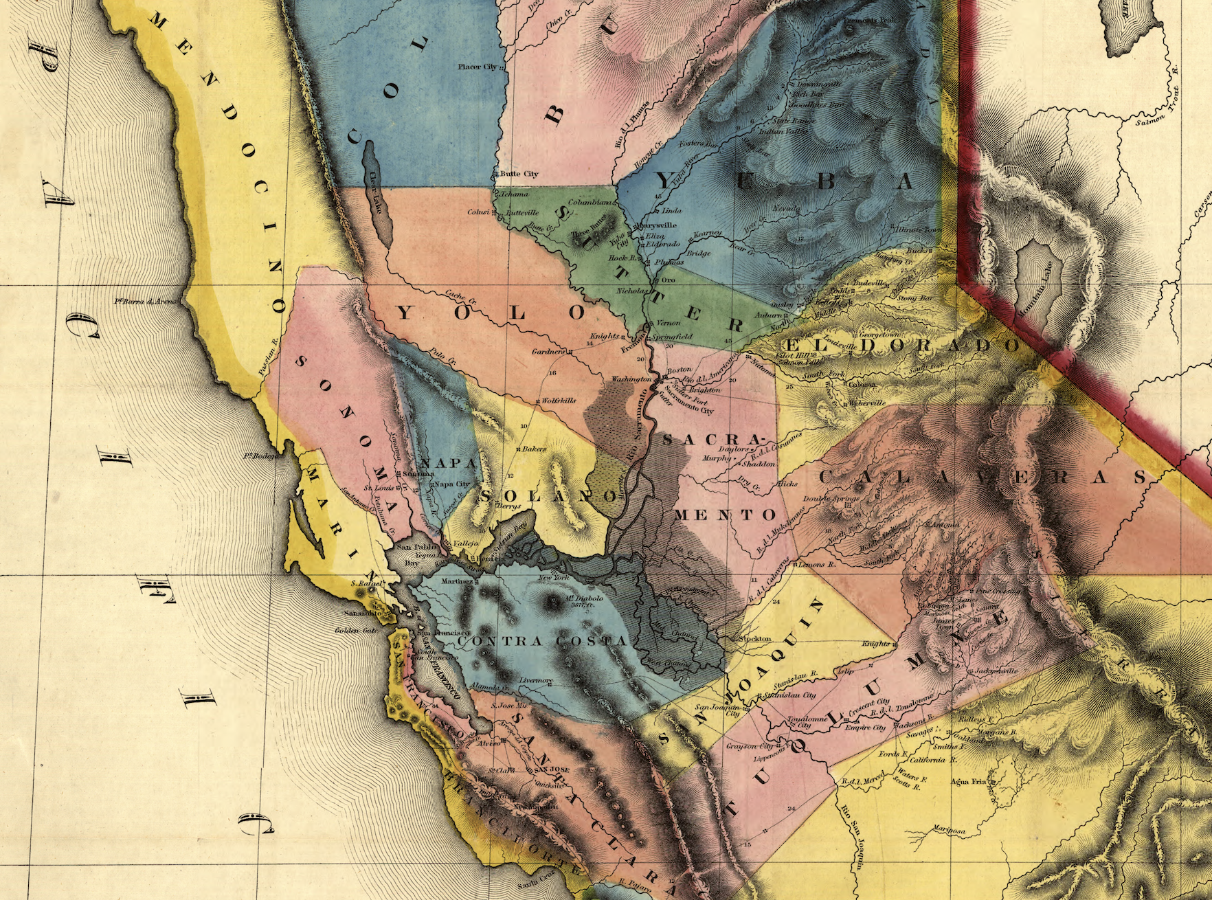The link of extraction to the omission of land claims indigenous peoples is abundantly evident in 1849. Preserved by the “Doctrine of Discovery,” the county lines that combined, as if seamlessly, native indigenous sounding and Spanish names melded the geography of ranchos and missions to the property claims, casting indigenous as without title on the map, and omitting those nations without property rights from the map, save in as evocative place names–“Yolo” or “Tuolomne”–now converted to areas of future land settlement by farming communities and vineyards, often, as “Sonoma” and “Mendocino,” named by Spanish navigators in honor or Antonio de Mendoza, Viceroy of New Spain, all but expunging indigenous presence from the territorial map. Many counties are bright yellow, but in this New Map of the Gold Country, the “Gold Country” announced with decorative fanfare in its title is not bound as a destination, but implicit in the logic of extracting capital form the new borders of the surveyed land.