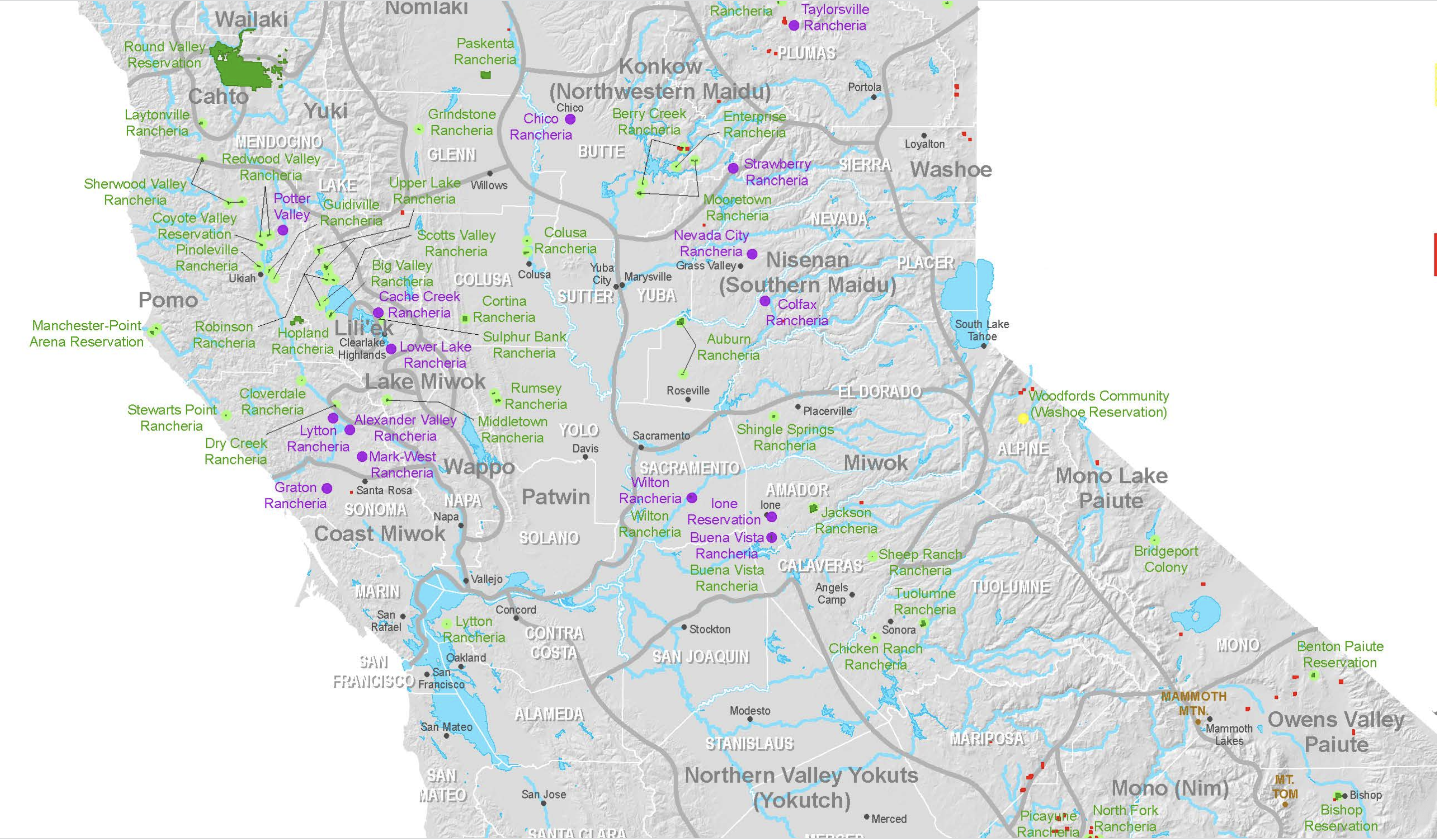 In the “Tribal Homelands” map is in a western cartographic idiom, the overlapping place-names, borders and boundaries around the state capitol of Sacramento and Bay Area are confusing, hard to process, and downright unclear to the viewer eager to read them. Dense rancheria of local “tribe-lets” that were unrecognized in the past, suggesting a sense of dense settlement that might only exist on the map–if it is refreshing to see the ancestral lands assume new precedence in a familiar map. One returns to the local value of the view on the current map, announcing the presence that has been so long marginalized, and indeed emphasizing the fragmented isolation of rancheria, isolated in points of limited access to the ancestral lands that have been so drastically transformed.