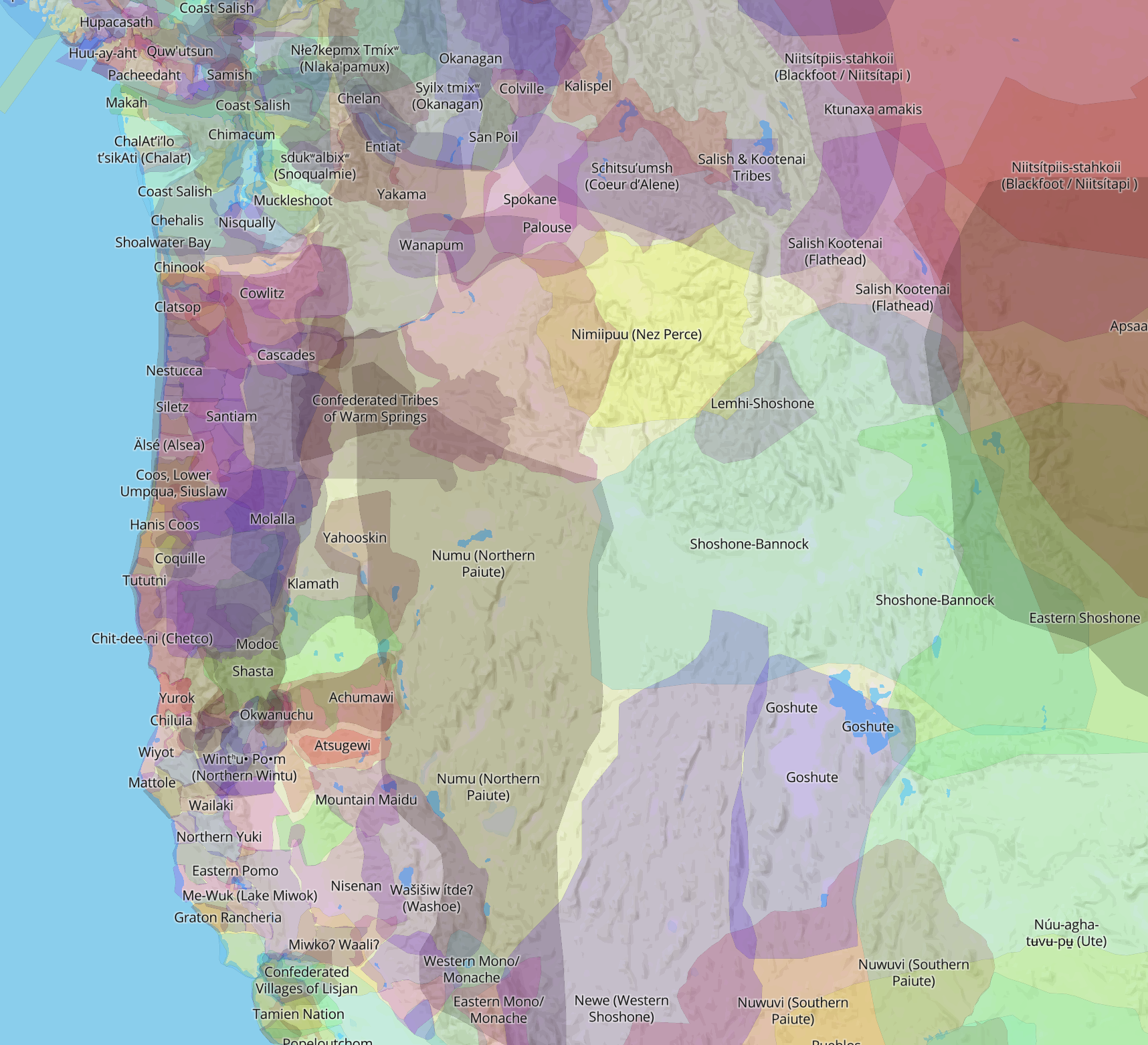 8. While quite clearly being explicit about its ability to “represent or intend to represent official or legal boundaries of any Indigenous nations,” and directing all interested in determining exact boundaries to consult the nations it maps, is there not a bit of an abdication of responsibility in putting such an admittedly glorious bouquet of pastels online as if they suggest a vision of comity, as much as there is something deeply valuable in having such an easily compiled online resource for mapping North America, and a clear reluctance to not hesitate to indicate the ways boundaries often overlap.