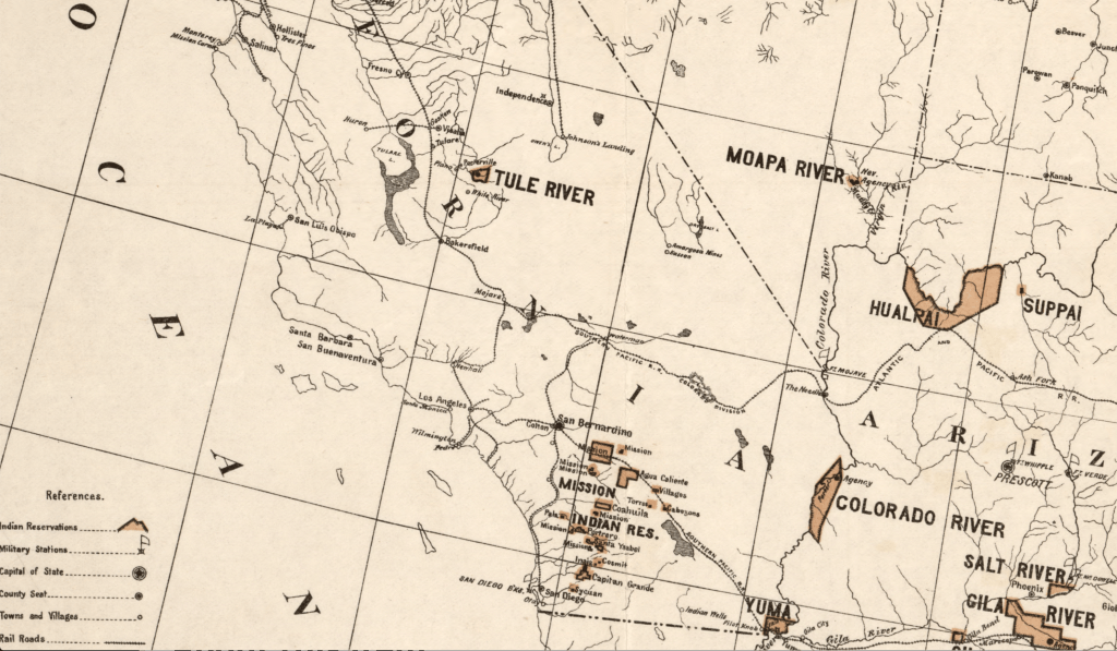 To be sure, Kroeber’s map could also be read as a distinctive counter map of sorts, affirming Indigenous presence, even if it did so in historical terms: if it pushed back against the notion of Manifest Destiny, it was a historical record that contrasted to the national map of “Indian reservations” issued by the Bureau of Indian Affairs, back in 1888, that marginalized native presence in California. This “base map” of current reservations where indigenous were confined dates before Kroeber studied with Franz Boas at Columbia University; when he was a ten year old in Hoboken, New Jersey, actual territorial confines had all but vacated indigenous land claims in the entire state of California, far from rivers or arable lands.