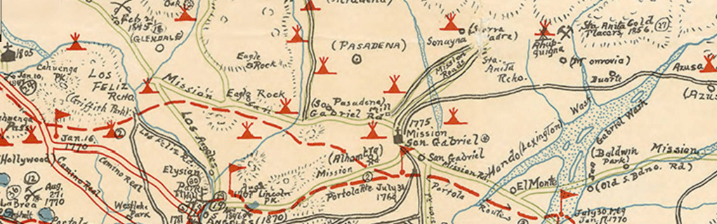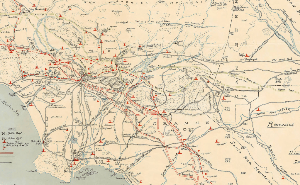 While the memory of habitation has long been deeply emotional accessing of the ancestral lands that preserve a common ties to the vanished sacred landscapes that genocide so cruelly erased, the prestige of GPS in accessing minerals and defining place has led to a an increased precision of place that helps apprehend the scale of genocide, and indeed stake out a “war of memory” about older but not always lost homelands. While such a memory of place was long emotional, the state of play revealed in the Los Angeles Basin by the pictorial Kirkman-Harriman pictorial map of Los Angles County. The pictorial map creates an image recording the intense habitation of the region but simultaneously defines it as a reality that was in the process of being actively relegated to past, and marginalized in the current landscape in which indigenous water rights were being denied. Although compiled and made in 1937, it offers a compellingly terrifying map of the state of play in the extermination of the residents of Yangna, ancestral home of the Tongva people, circa 1850, that demands greater attention, detailing the wars and engagements that drove Tongva from the villages that once dotted the Basin and its rivers, from the Santa Monica shore to what is now the San Fernando Valley, across the current Beverly Hills and far past the Santa Ana River, a dense network of indigenous villages linked and tied by trading routes.