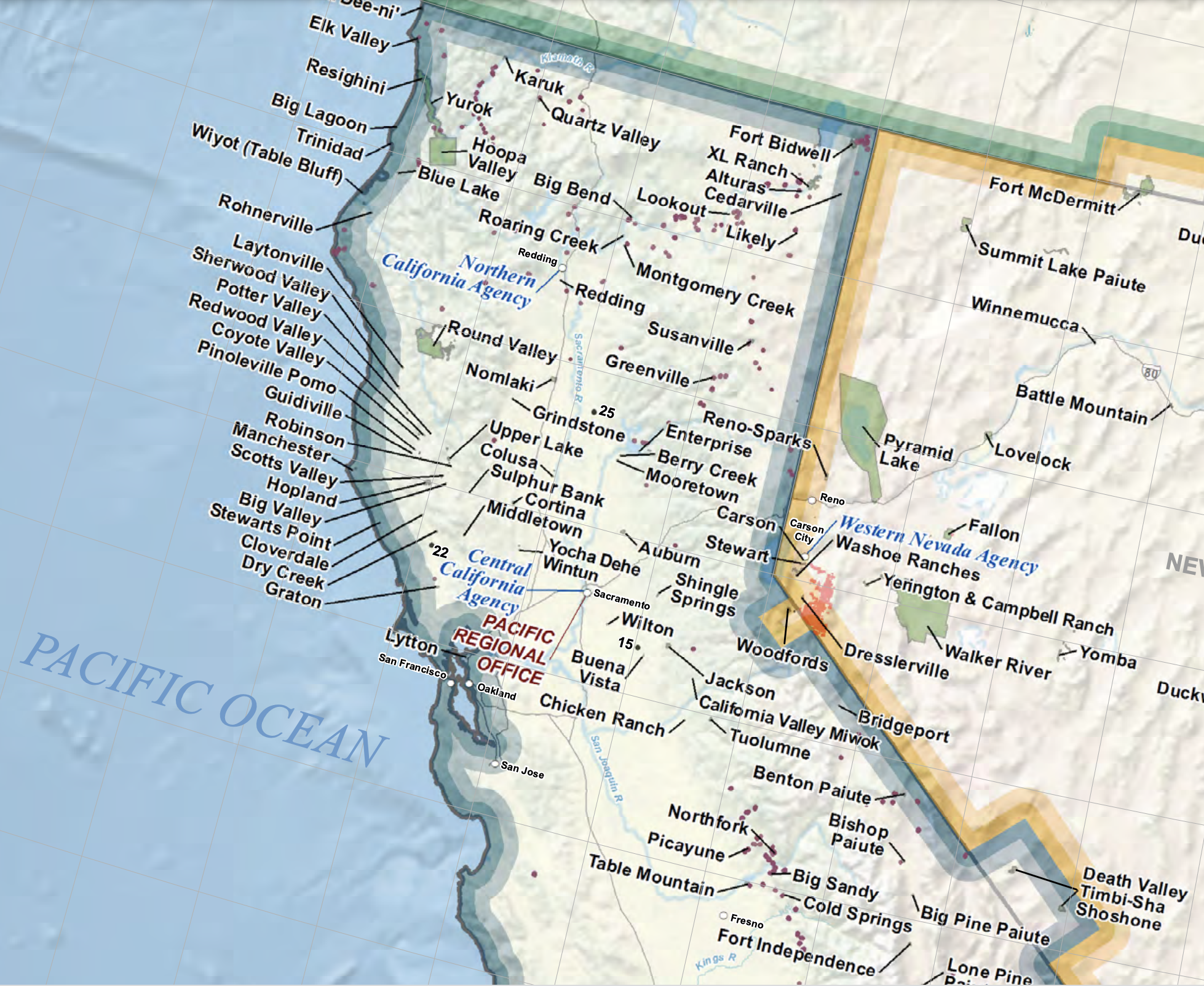 6. It only makes sense, ethically, to carry this narrative through the current map of isolated areas of recognition and land acknowledgements in the current state, against the multiple tribal communities of Bureau of Indian Affairs’ Pacific Region against “Tribal Lands” in the interstate area of “Region Nine.” The distancing of the notion of “tribal” land as a relegation to a state of nature is implicit in the push to recognize indigenous land claims as “native”–not “tribal.”