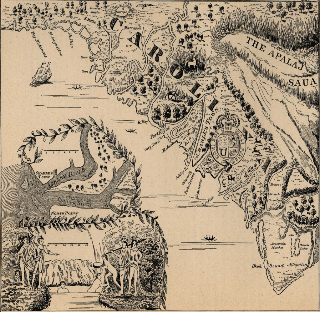 Perhaps looking at Blaue’s map provided a basis for the natural process Locke described of those who will “make themselves Members of some Politick Society,” and leave that State of Nature, and in leaving that state of nature departure “give us Property [but] also bound that Property.” The proximity of the three-masted ship to the coast of the Carolinas look out at the rivers that nourish the Carolina plains, as if to suggest the imminent possibilities of bounding the rich region they observed as property, transforming it from the state of nature in which goods and resources remained common property, and but by submitting to a commonwealth to protect and preserve property.