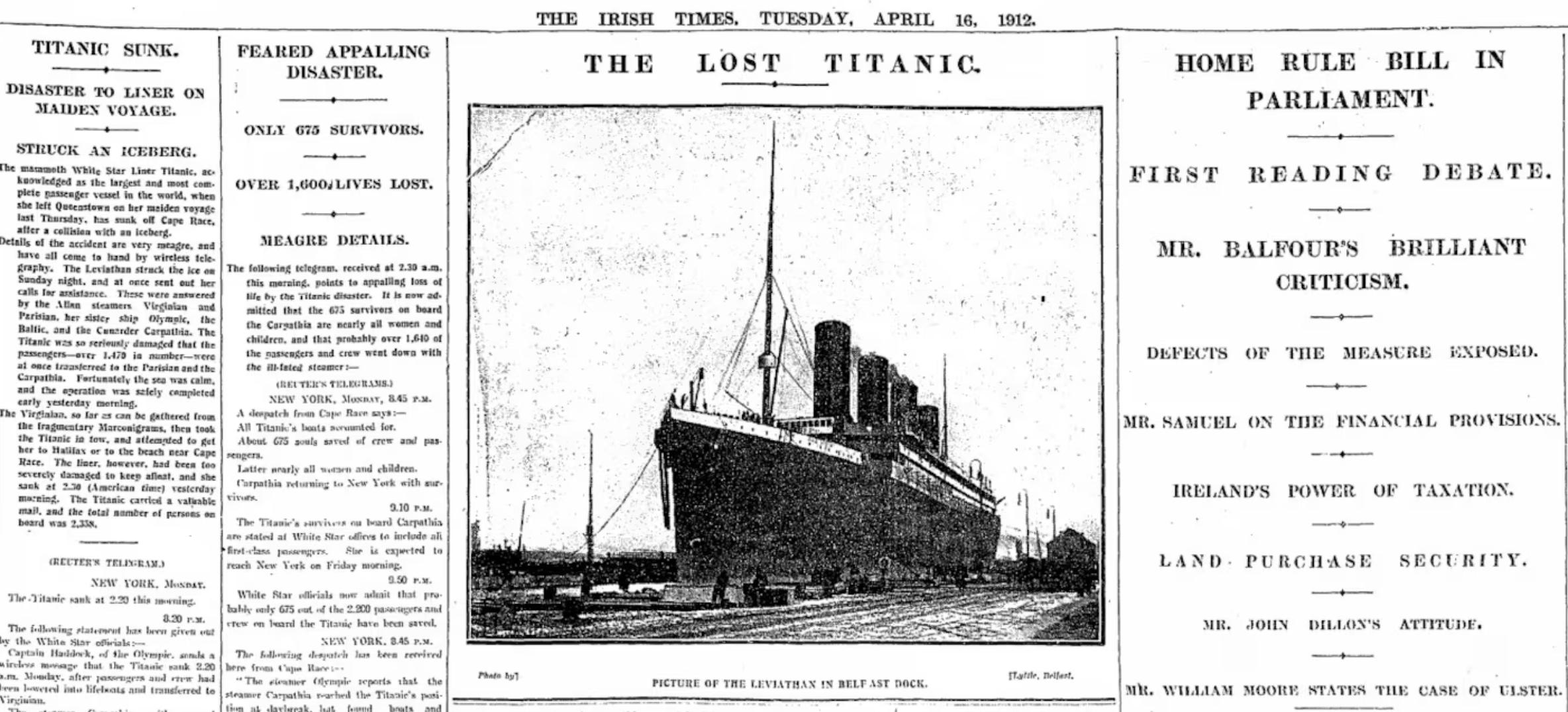 The ocean liner’s tragedy was announced in Ireland, appearing in daily newspapers framed between issues of Home Rule as “an appalling disaster” that was very local as well as global: “the lost Titanic” included eleven from County Mayo, onboarded in County Cork, and six from Belfast traveling to Spokane in the state of Washington to start new lives in America–and five other Irish lives had been lost in its construction in Belfast. Joyce was inevitably attracted by the topic in discussions with sailors at the Mediterranean port city Trieste, whose company he sought out so soon after arriving with his twenty year old Nora Barnacle in October, 1904, to leave her at the train station as he sought out housing. The Mediterranean port he began Ulysses was where he probably heard boasts of sailors traveling the world’s seas he transposed to the sailors in Italian in Dublin–but he would have been haunted by the “Lost Titanic” prominently bemoaned in the Irish Times. But the global scale of the catastrophe offered a new mythology that provided the modern bookend to the Odyssean perilous that the eighteen chapters or episodes of the novel he wrote spanned.