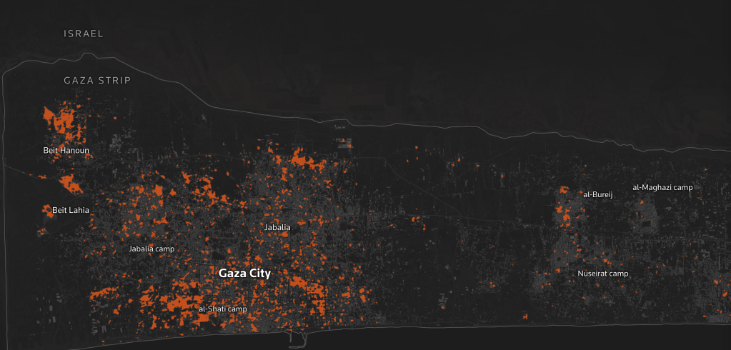 The threat that Gaza poses to the nation’s security is however different from military invasions of fifty years past. The focus on enclosing Gaza, and technologically contain the Palestinian presence from Israel as a state, has led to a logic of containment, deeply troublesome on humanitarian grounds, and seemingly without ethical grounds. Bracketing an enclave with intentions to splinter Palestinian Authority is hardly an enclave on strong legs. Yet from 2019, before the pandemic, before the Ukraine War, the blocking out of Gaza’s plight as a non-state was clear. The cascading possibilities of cross-border attacks charged to have begun from Lebanon on the IDF, as over 6,000 Israeli bombs on Gaza within a week after the October 7 attacks,–flattening large swaths of the city’s neighborhoods as wasteland, targeting neighborhoods where the deadly attacks on Israel were directed abut displacing over a million as IDF troops massed on the border with the Gaza Strip, as airplane bombing reduced many of the cities and urban infrastructure to rubble.