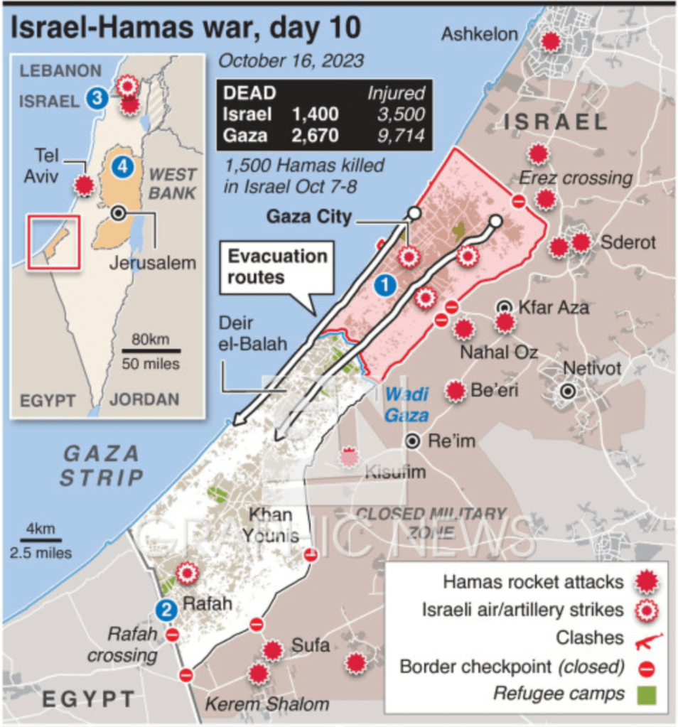 Even if Israel’s Defense Minister, Yoav Gallant, vouched to the Knesset that Israel has chosen to relinquish all “responsibility for life in the Gaza Strip,” the sustained bombing campaign has dwarfed all other assaults in the area. If he or Netanyahu believe Israel can isolate, bracket, and separate Gaza from Middle East politics and the minds of Israelis, the focus on a “new security reality” was upended by thee fears bared in the horrifically devastating invasion of border villages near the Gaza Strip, seeking only to eliminate the presence of Hamas before they “disconnect the umbilical cord” that has tied Israel to the region, the haunting images of the border boundary that will continue after the violent incursion planned and orchestrated by Hamas traumatized the nation by leaving over 1,400 people dead and more than 3,500 injured, numbers that spiraled rapidly into a retributive bombing campaigns killing 8,000. The umbilical cords that tie Palestinians in the West Bank and Gaza will continue, and are not to be fully addressed, nor are, it seems, the corridors of safe passage that residents of Gaza have long deserved.