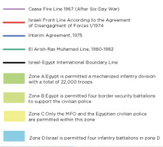 Shifting line from Cease fire in 1967 (Violent) to Muhammed Line, 1980-82 (Green) to Current National Boundary (Black); Zones Where Egypt is Permitted Infantry, Security Battalions; Civil Police