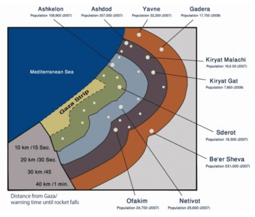 The same alarmist catalogue of the weapons that were posed at Israel’s cities by a range of rockets from the international market–Qassam, Katyusha, GRAD, and Iranian M-302, M-75, and Fajr-5–were suddenly aimed by surrogates at ranges to reach m-and Israeli populations in Tel Aviv or Jerusalem–were mapped, of course, by the IDF itself, who are tasked to guard Israel’s borders. as an armory poised at most all of Israel’s cities, far from the Gaza Strip, a decade ago. But we had the illusion, or geographic imaginary, for a decade, that those dwelling near the Gaza Strip were as protected as anyone else in the nation, and did not suffer any special degree of vulnerability.