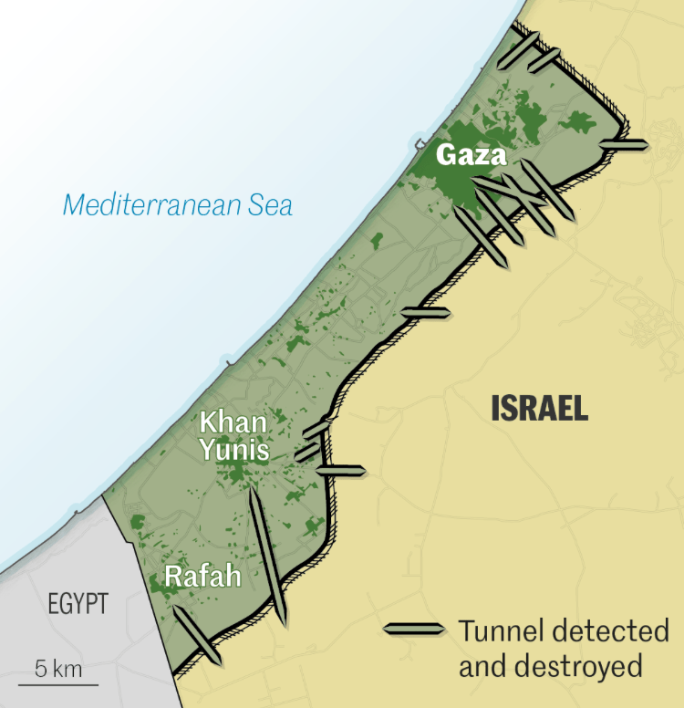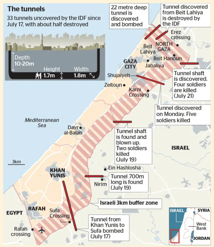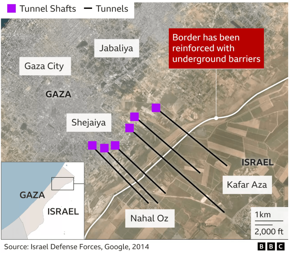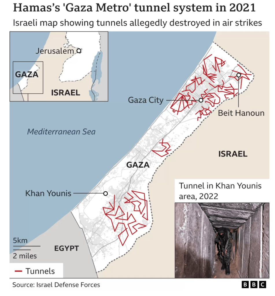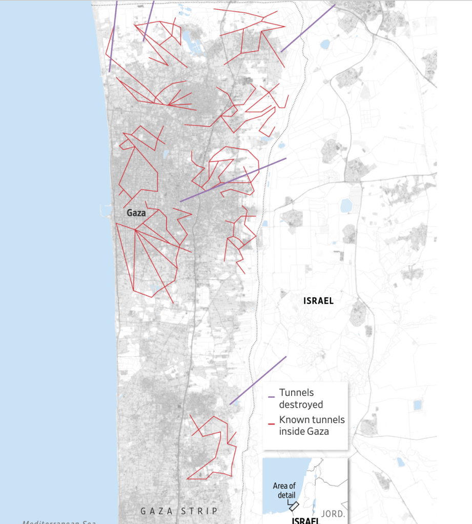 11. The sense of security and stability of securitization rocked the nation’s leadership as a huge defeat of the promise of security. Despite the destruction of twenty-three tunnels in a previous Gaza War, Operation Protective Edge in 2014, the world saw that tunnel network has been long identified as a military asset was alive, and needed to be targeted with a vengeance of Deuteronomic proportions, intent to extirpate the site for planning and storing weapons for the October 7 attack of surrounding settlements and drive Hamas from the enclave it was effectively entrenched. If the settlements surrounding the Gaza Strip were targets of Hamas–they were homes many of the Jews in the Gaza Strip had resettled–the defensive tunnel network seems ago be the grounds for continuing a long, drawn-out war different from what Israel had imagined or was prepared.