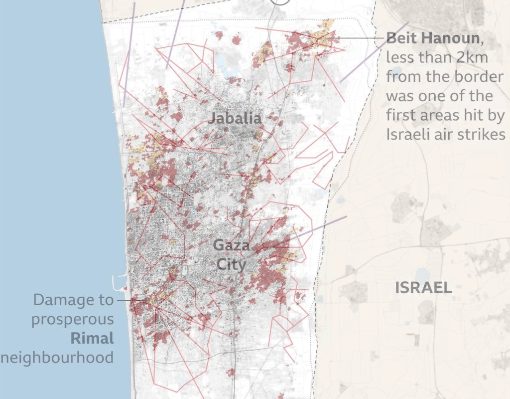 The new tunneling through the ridges of the Gaza Strip challenges not only the surveillance of Gaza residents, or the geocoding of sites of missile launchers, but the mapping of national boundaries and sovereign states. The true targets are opaque, and underground, but open up a new horizon of “subterranean geopolitics” that has been rarely mapped. Bomb damage maps of the Gaza Strip that appeared within weeks after terrorists invaded Israeli territory in 2023 more viscously than ever before, and their vicious razing of residential areas where Hamas has long concentrated its tunnel network revealed a new anger and rage at the network as if it was the prime target of attack. Prime Minister Benjamin Netanyahu sought to reiterate as he announced a mass mobilization on national television in an exceptional Sabbath, the nation was “not in an ‘operation,’ or in ‘rounds,’ but at war.” The current realization of a far more extensive tunnel network in 2023 Gaza War led to their being seen as a new existential threat–not only as a means to cross the border Israel has defined between areas of Israeli sovereignty and the Gaza Strip, but as a target in need of destruction.