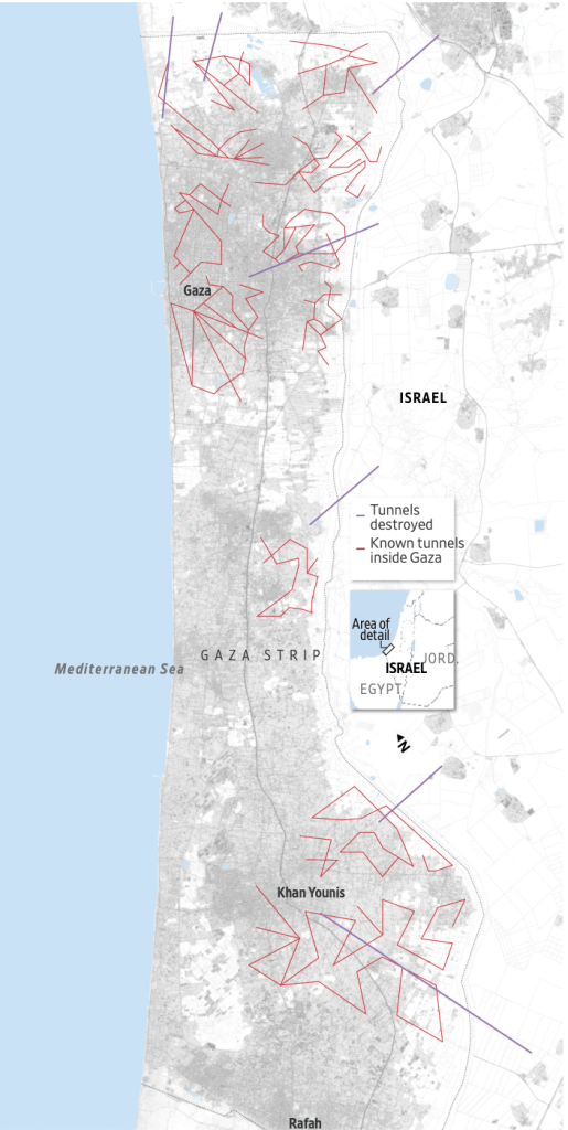 2. The networks of underground tunnels that grew up to support Gaza’s literally “underground” economy as its borders were closed by Israeli Defense Forces in 2005 became, in 2012 and 2014, the targets of invasion and destruction–as airplanes targeted five hundred tunnels, some of hundred kilometers, as one that running from the South to Gaza City, by bombardment and ground operations–destroying 140 smuggling tunnels that evaded the Gaza blockade, including 66 tunnels used to target Israeli forces. The engineering of tunnels expanded to deeper and broader underground corridors to ferry cars of militants and reinforced by iron, with ventilation for larger mobilization, the network emerged in global consciousness as a new terrain of combat, and a new battleground lying far beneath the ground. Even if North Gaza has, as Israel insists, ceased to be under the sovereignty of Hamas from January 2024, the tunnel network dug beneath the territory has provided the firmest illustration of the survival and resilience of Hamas governance in Gaza.