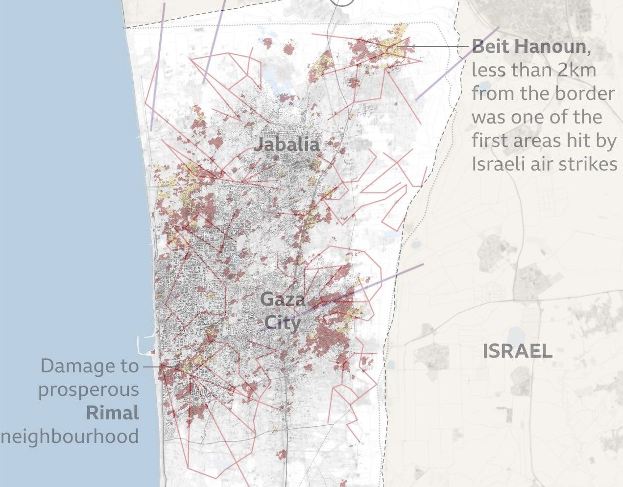 The scale and intensity of the bombing is hard to grasp by a data visualization, but marked the first forced migration of Palestinian residents southward, and was of course not yet close to complete.