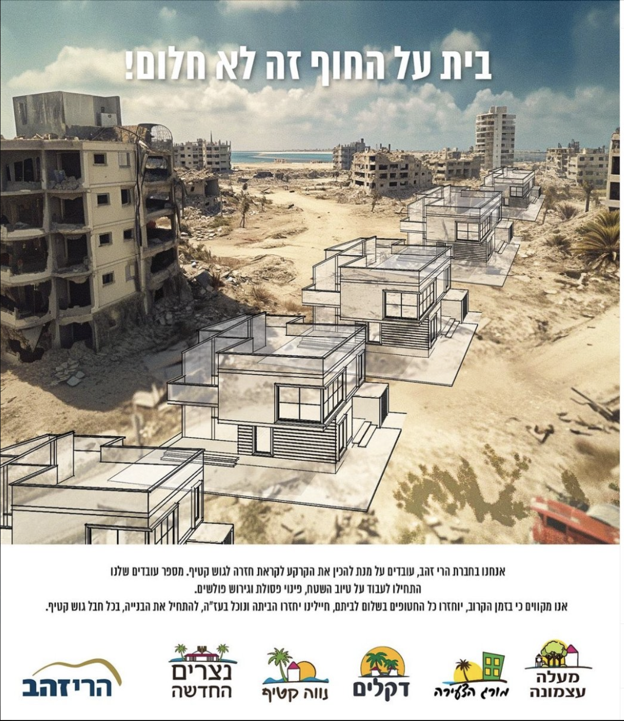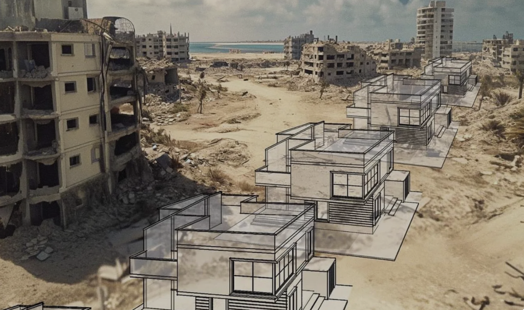 The vulgar architectural mock-up image is all too easy to tie to the worst anti-semitic stereotypes of rapacious real estate firms, the poster raises questions–as if they were never considered–of the future of a bombed out landscape with no hope for a suitable Marshall Plan to front the level of destruction continued bombardment created on the misbegotten Gaza Strip, and what reality it will bring. While right-wing groups as the Misgav Institute for National Security & Zionist Strategy have quite unethically and unconscionably declared that “there is currently a unique and rare opportunity to evacuate the entire Gaza Strip” that led to charges of how “[an] Israeli real estate firm is already cashing in on genocide,” producing blueprints that flip bombed out areas on the Gaza coast into luxury condominiums that recall Florida or the Mediterranean villas of the South of France, incredulous at the callousness occupying Palestine, the firm quickly backpedalled on what they called a “joke” on the drafting table as the image verged on provoking international horror.