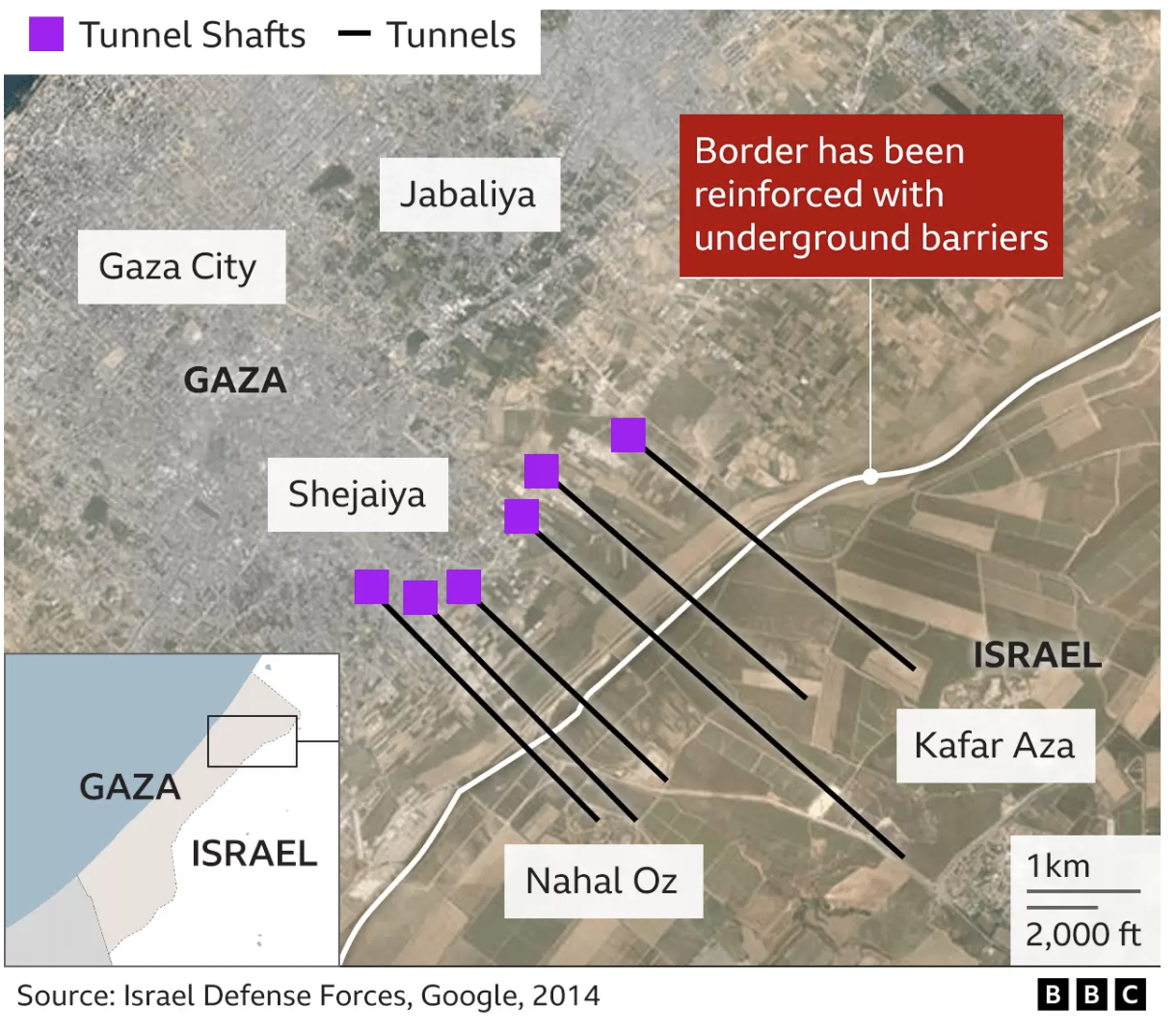 Many “tunnels” were mapped at border checkpoints, it was revealed in offering clandestine modes of smuggling arms and money into the Gaza Strip it was revealed in 2014, circumventing the eyes of the very IDF troops who monotirood the border crossings–moving beneath the surveillance networks of the border fence beneath outposts of the IDF troops standing guard above, raising questions and fears for the first time of an underground war.