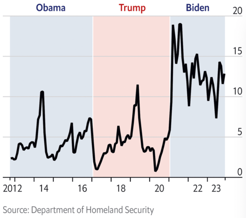 The vignette was a theatrical reminder of the need to “immediately end the migrant invasion of America,” blurring the need to “stop migrant flights, end all illegal entries, [and] terminate the Kamala phone app for smuggling illegals as if they were all contributing to an invasion we allowed–although the misleading chart he was so fond of displaying that suggested an emergency indicated not “illegal immigration” at all, but Border Patrol statistics on those stopped at the border, not admitted, and the drop in immigration arrivals of the pandemic shot up in his Presidency, readers of the Washington Post, before it became an organ of government, were reminded over a month after Trump presented the meme domestic pets had been injured by immigrants who crossed the border.