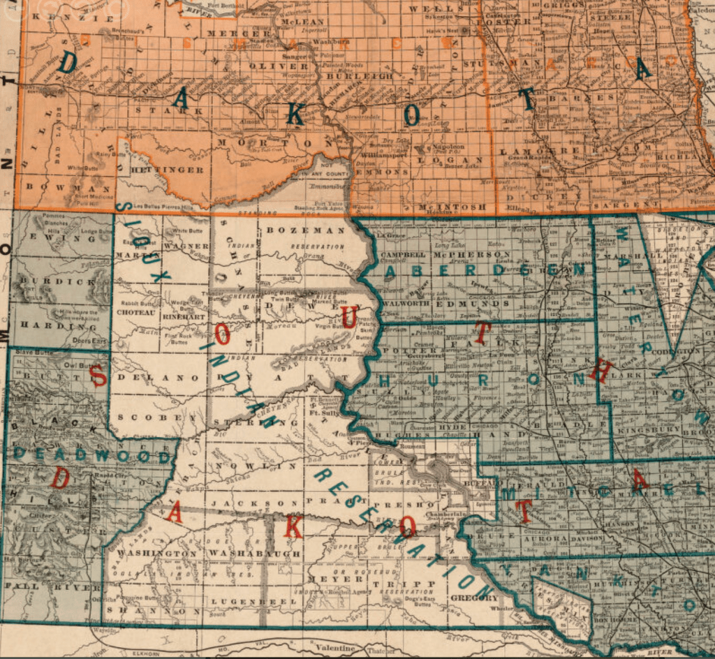 Official Map of the Dakotas, Showing the Two General Divisions of Dakota, North and South, the Land Districts, Indian Reservations, Counties, Towns and Railroads (1886)/Leventhal Map Collections, Boston Public Library (detail)