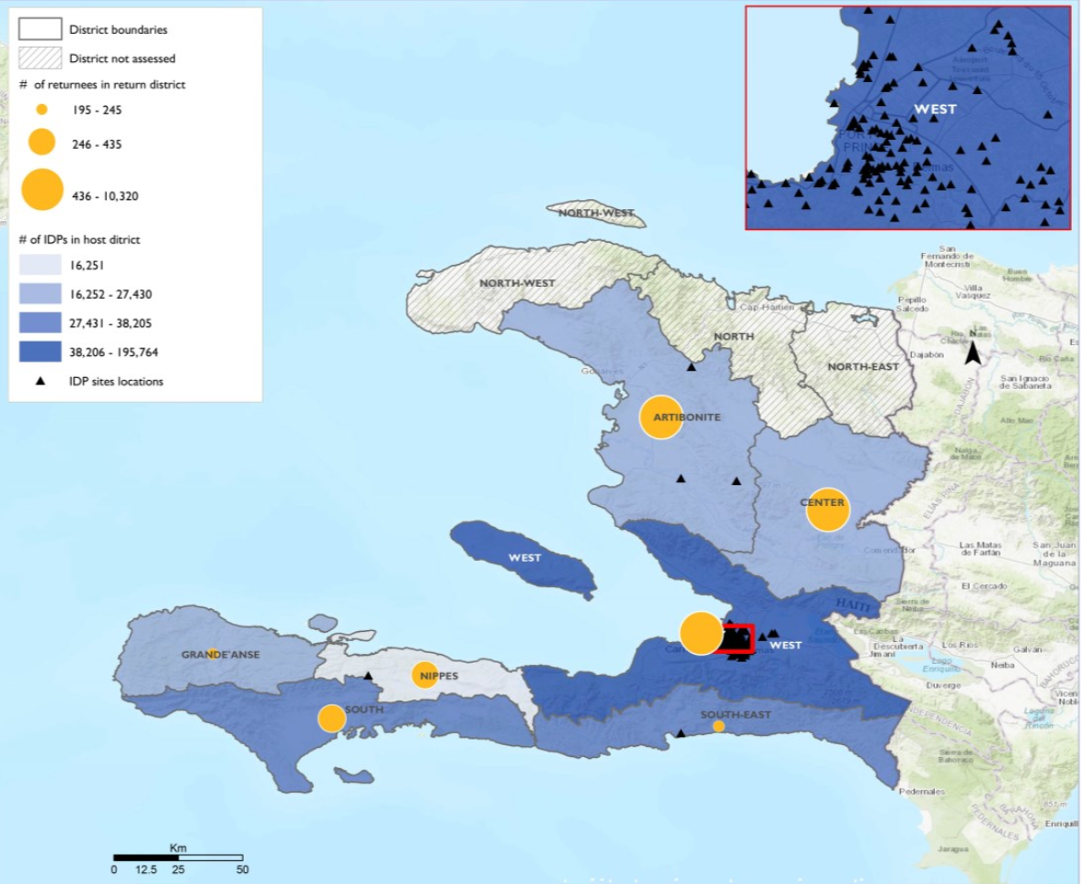 That actual map might well have been a topic for a true Presidential debate was the rise of a terrifying number of displaced persons in Haiti–almost 80,000 displaced households; far over 350,00 internally displaced peoples in recent months of early 2024–and the western hemisphere; not of Haitian immigrants baselessly rumored to eat dogs. The escalation of IDP’s, including some 25,000 “returnees” forcibly flown back to Haiti–per the Displacement Mapping Matrix of the International Organization for Migrations–was astonishing and truly terrifying, the mores as some 50%–over half!–of internally displaced are children, most in the terrifyingly lawless region of Port-au-Prince, where the entire social fabric has unravelled–even if the renditions are flying from the border, many removed from under bridges in Del Rio TX, having crossed the “border” from Mexico, flown in planes from Louisiana, and Florida to alternative airports to navigate chaos on the ground in Touissant Louverture International in Port-au-Prince.
