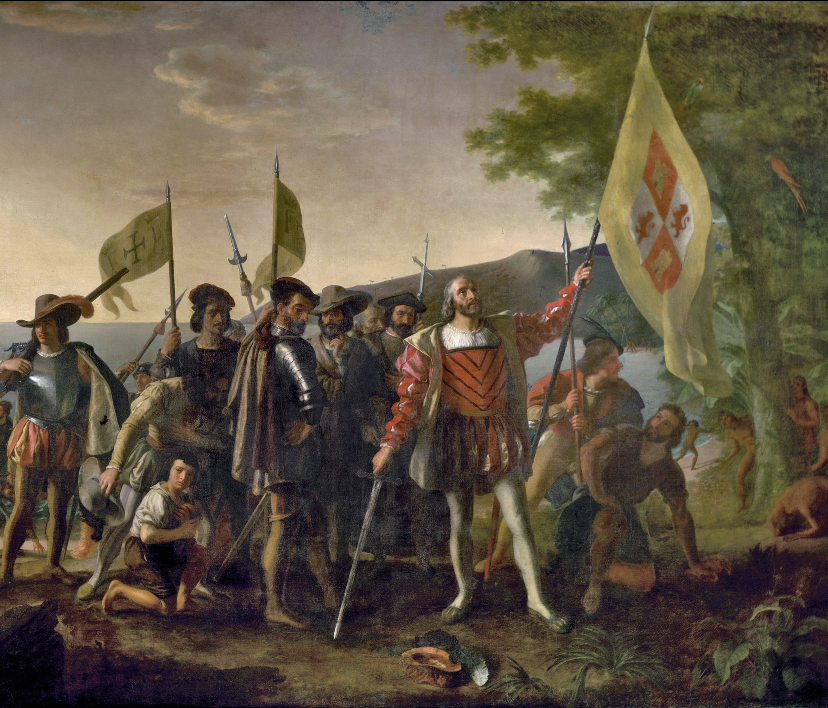 The painting was commissioned by the U.S. Congress in 1836, at the same time as indigenous lands were being seized by the federal government, featured Columbus looking heavenward pointing a sword to the ground, as a friar holds a cross, while unclothed indigenous hiding behind a tree watch the arrival of armed soldiers, beside a dog, as sailors who eagerly search for plentiful gold in its sands. Europeans brought a new variety of dogs as a sign of their arrival, having domesticated dogs far earlier, and developing over 20,000 years inter-species affection and communication and affection.