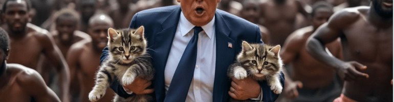 There was almost the sense in Trump’s odd declaration in response to question about immigration to the United States that he expected us to believe at least some of those twenty-thousand might actually have, even if legal immigrants, crossed a threshold of civil behavior and violated one of the greatest taboos in the lands the AI image in the header to this post tries to conjure. “They’re eating the dogs” launched the most recent addition to the laundry list of the hidden cost Americans pay for a poorly policed border–but it raised the bar beyond criminality; dealing drugs; belonging to gangs; taking jobs; and taking housing. When I canvassed for Kamala Harris in Nevada, it was memorable that a friendly man on whose door I knocked in Carson City smiled as he lifted his cute kitty before me, assuring me at once that he would soon be voting Democratic and loved his pet– “[’cause] I don’t eat dogs; I don’t eat cats.”