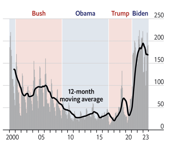The vignette was a theatrical reminder of the need to “immediately end the migrant invasion of America,” blurring the need to “stop migrant flights, end all illegal entries, [and] terminate the Kamala phone app for smuggling illegals as if they were all contributing to an invasion we allowed–although the misleading chart he was so fond of displaying that suggested an emergency indicated not “illegal immigration” at all, but Border Patrol statistics on those stopped at the border, not admitted, and the drop in immigration arrivals of the pandemic shot up in his Presidency, readers of the Washington Post, before it became an organ of government, were reminded over a month after Trump presented the meme domestic pets had been injured by immigrants who crossed the border.