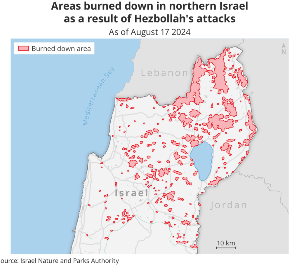 The border was already destroyed, or rendered uninhabitable, by the fleeing of almost a million from the once fertile borderlands. The destruction of all of this once fertile land–and especially so much of the Golan Heights which Israeli farmers and “cowboys” raising livestock. Over 30,000 acres to be burned in Lebanon and Israel by early July, up from 4,000 acres burned in northern Israel by June. The hot “fire season” across the region has led fires sparked perhaps by incendiaries to be more fierce and worrisome n ways that has only raised the temperatures of all involved. While these border tensions had been simmering for months after the October 7 attack, they were manifested in open blazes and scorched earth whose on the ground consequences not yet assessed.