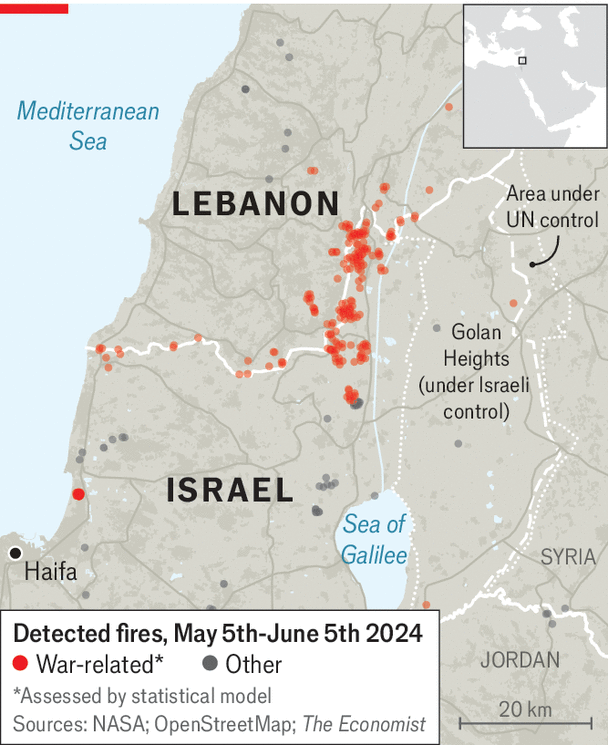 As about 10,000 acres burned in southern Lebanon due to Israeli air strikes, an four-fold increase of the size of previous burns across all of Lebanon, open areas were allowed to burn if not near villages or towns, leaving much of the border-zone between Israel and Lebanon uninhabitable, and displacing nearly a 100,000 in Lebanon and 60,000 in Israel in the first half of 2024.