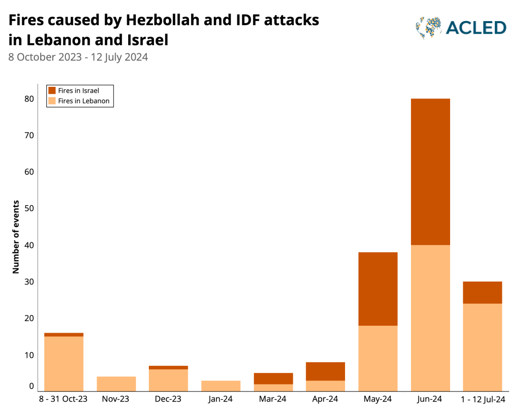 Numbers of Fires in Israel and Lebanon caused by Hezbollah and Israeli Forces/Armed Conflict Location and Event Data