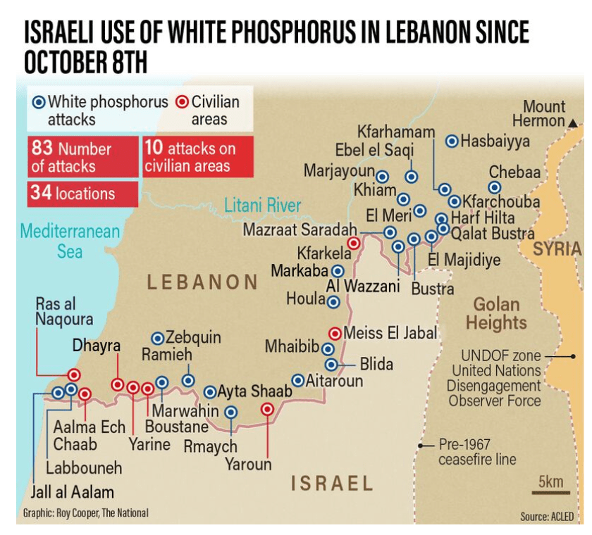The extension across Lebanon of the bomb strikes by September 23 may have responded to Nasrallah’s taunts to enter Lebanon on September 20. Broad devastation by fires of an increasing amount of rural countryside from pummeling of Hezbollah targets cannot help but conceal the extent of an actual holocaust, during by incendiary strikes the once-fertile landscape of olive and avocado trees of farming communities, in act of dispossession of the terrain of Southern Lebanon in the name of border security. If fires in Israeli land and the abandonment of territory near the border boosted support for the strikes against targets in Lebanon, the firing of white phosphorus munitions of highly incendiary bombs that burn in contact with oxygen have transformed the landscape. While the use of these prohibited and illegal munitions seem intended to create a smokescreen cover for troops or retrieving wounded soldiers, their function was far more than to create a “buffer zone” of security in the northern border. In setting upwards of a hundred and twenty forest and farmland fires the land was rendered inhabitable, and a scene of ecocide. During the strategic attacks and burning of land, Nasrallah had decried attacks “unprecedented in the history of the resistance, Lebanon, and the conflict with Israel just days before his death, all but challenging a land invasion by land into Lebanon to occur, outraged at the aerial bombardments.