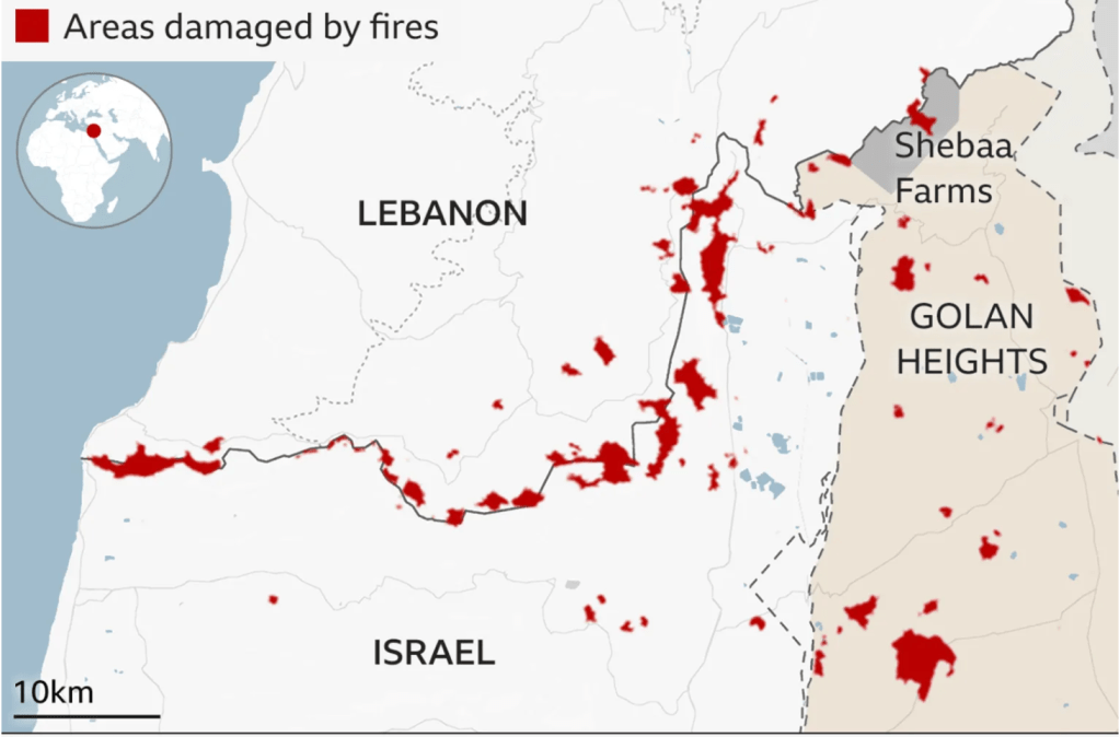 Nasrallah had openly threatened in one of his final public appearances “just punishment” and military retribution if Lebanon was attacked was fierce. It omitted the pressure on a forceful response to the over 21,000 acres of Israeli land in the wildfires that have increasingly spread in the north–the most expansive since the 2006 war–reflecting in part how much more Israel believes Hezbollah to be entrenched in border towns. The resistance to burnt land that Israel has attacked by incendiary rockets in a hot, hot summer will no doubt spur a local resistance tantamount to the resistance of Vietnamese whose land was torched years ago.