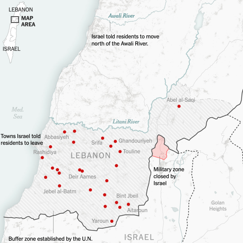 That demand, echoing the demand to return to the so-called “blue line”of 2000, has been expanded, by the Israeli Defense Forces, to include all villages between the Awali River and the border,–some thirty-five miles north of the Blue Line, where Israel believes an infrastructure of attack and fortifications have been created beneath residences. The system of tunnels analogous to what they confronted in the Gaza Strip, were structures of Iranian fabrication, and demands to evacuate the thirty villages in South Lebanon subject to “limited, localized, and targeted raids” if not, officially, targeting residences and homes, targeted offensive infrastructure they conceal, demanding all towns of 60,000 be evacuated south of the Awali, in a buffer zone that extends deep into Lebanon–some 40% of which is now an evacuation zone.