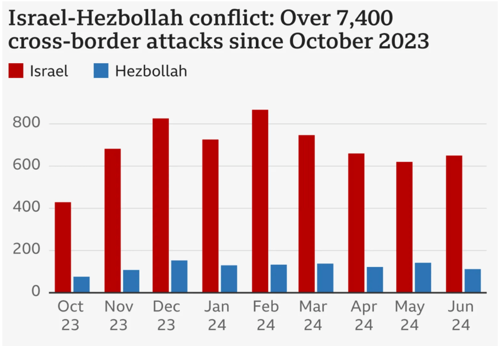 These boundaries were of course historically contingent. If Gaza had lain in the “deserts of Egypt” in 1956, near the Sinai, Egypt’s sovereign lands, “Gaza” lying in Egypt’s sands in the Nakba, the catastrophe of the violent removal of Palestinians, as air strikes began over the Gaza Strip after the invasion of October 7, as Israel asserted the right to defend Israel’s boundaries, in response to the perimeter fallen after the invasion, the expansion of the remit to defend Israeli security had grown in the increased border conflicts with Lebanon since October 7. Without ever invading Lebanon, Israel showed the vulnerability of the nation state, and stands in dialogue with the invasions of October 6. If Nasrallah sustained Israel had crossed red lines in its sustained incendiary aerial attacks, the spate of cross-border Israeli missile strikes–responded to in kind by Hezbollah–to take out the rocket-launchers pointed to strike at Israeli territory in the Golan Heights, the number of cross-border strikes was a dense onslaught from October 7, 2023 to late May, 2024–