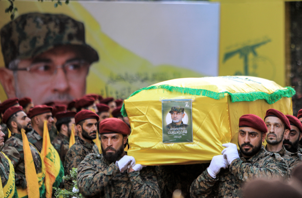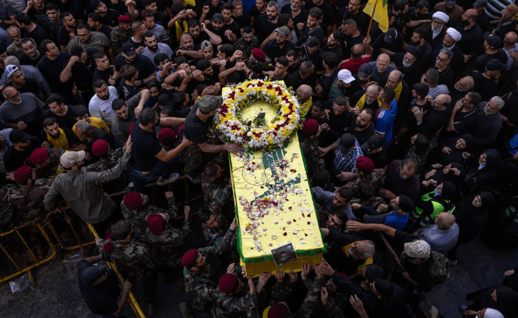 Bier of Hezbollah’s top military commander Ibrahim in Beirut’s southern suburbs on September 22/ AFP