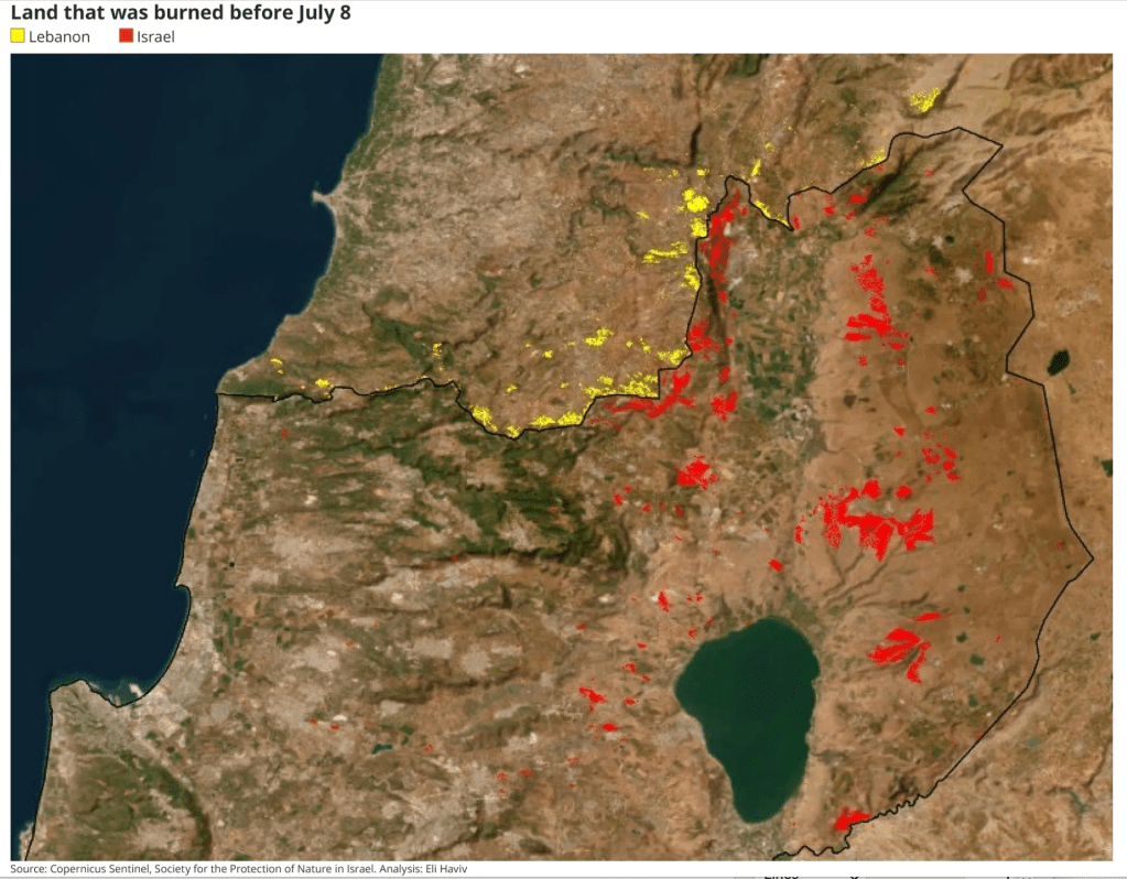 As about 10,000 acres burned in southern Lebanon due to Israeli air strikes, an four-fold increase of the size of previous burns across all of Lebanon, open areas were allowed to burn if not near villages or towns, leaving much of the border-zone between Israel and Lebanon uninhabitable, and displacing nearly a 100,000 in Lebanon and 60,000 in Israel in the first half of 2024.