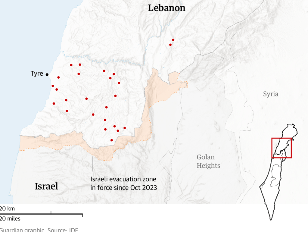 Increased Expansion of Evacuation Zone in Lebanon, October 2024/The Guardian Israeli military, data from United Nations Interim Force In Lebanon, OpenStreetMap
