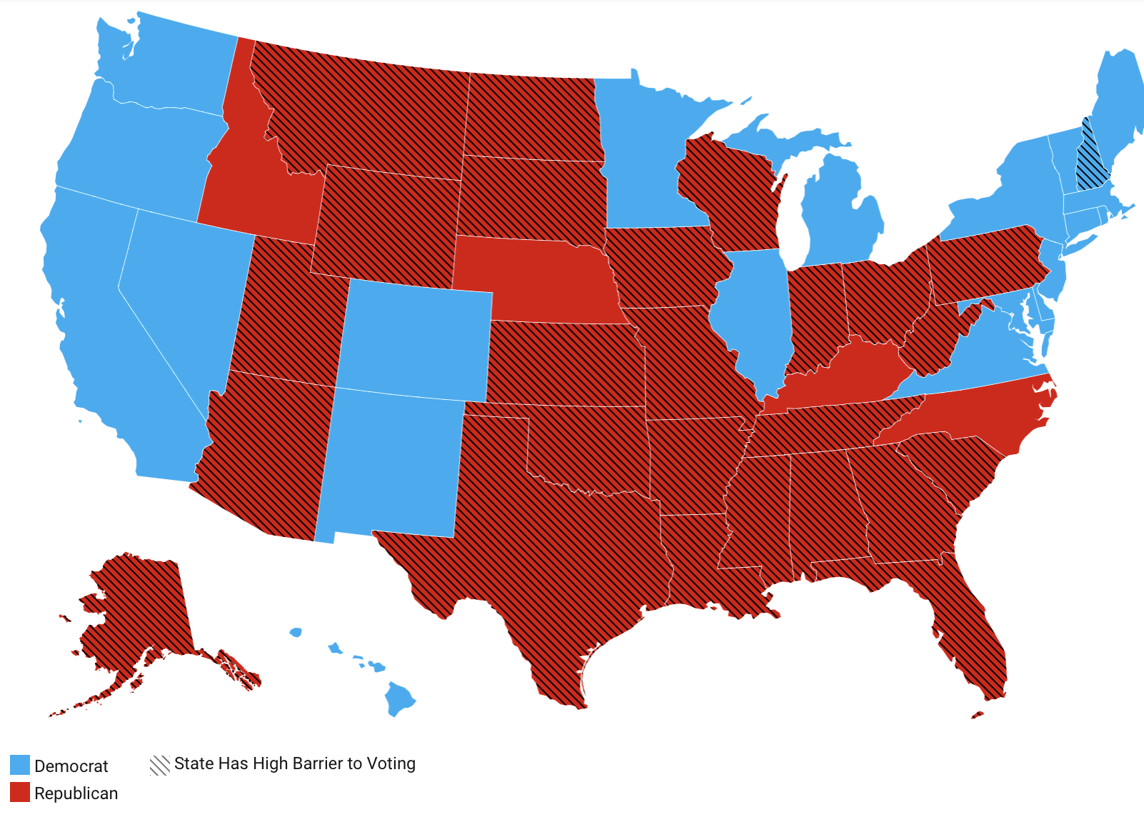 We haven’t seen the full numbers, but are worried that voter participation substantially declined for reasons we cannot as of yet drill down. One reason seems to have been boredom or apathy. With Trump winning what seems exactly 50%–not even a real majority of votes–the decisive nature of the shift may be visually exaggerated by the above aggregation. Perhaps access to polling had indeed contracted, with poll closures and the restrictions to legal access to the ballot, as zombie specters of dead voters, illegal immigrant voters, and convicted voters were painted as threats to the Republic. We heard less of restrictions on ballot access that may have existed–more about the poll watchers vigilante groups like the Proud Boys were prepared to provide may have intimidated voters–and less about the restrictions of ballot access and the distance from convictions that a vote would have an impact in the national government’s direction and role in one’s life.