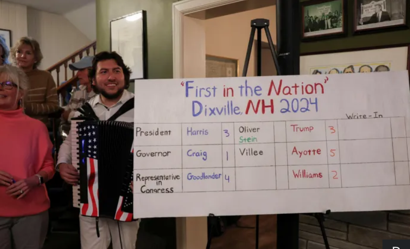 These divided scenarios were pure conjecture, but the possible projections of dissensus seem in the grain of the hair’s breadth margin of error margins of each candidate in the current election, a result that was forebodingly augured, as if right on cue, by the first tally reported votes in the 2024 election, up at the local redoubt of Dixville Notch, NH where the polls open at midnight, and the first results are drawn on a whiteboard for public view. The six votes for President split evenly, a patriotic result worthy of a rendition of the Star Spangled Banner on a stars’n’stripes accordion to accompany the unveiling of the votes’ tabulation on a white board written in red, white and blue.