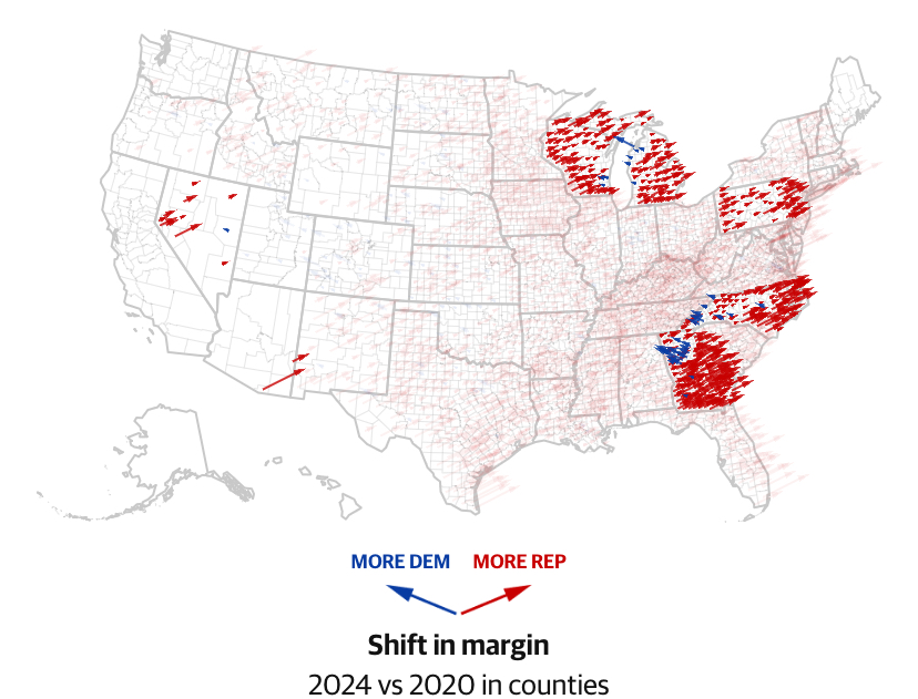 But the uphill nature of the battle was foregrounded by the shift in the votes in swing state battlegrounds, as it were, with a clear redder shift of not the metropoles of the states said to swing the pendulum and decide the future President, as Nevada, much of Pennsylvania, North Carolina, and Michigan had already shifted in 2020 to vote for the very same Republican candidate, and parts of Arizona shifted for the orange haired Republican in considerable numbers, in ways that made the ground game hard to know how to organize effectively, difficult not to see as challenging battlegrounds. Part of the shock of the first election that had surprisingly sent Trump to the Oval Office was the deep shift in the very same swing states that had swung suddenly Republican–red–as the counties of the “blue wall” shifted rather alarmingly, and northern Michigan, Minnesota, Pennsylvania, and Nevada shifted Republican by a fifth or over from the previous election!