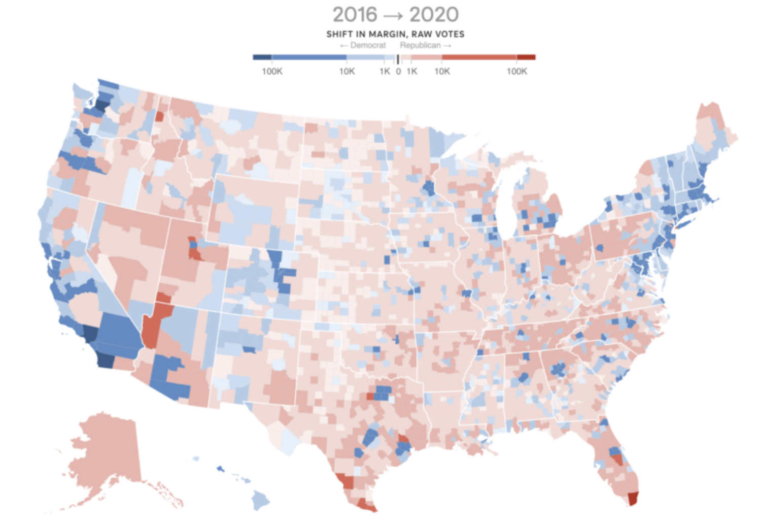 Shift in Voters from 2016 to 2020, Based on Final Certified Election Results by Associated Press (Connie Hanzhang Jin and Daniel Wood/NPR)