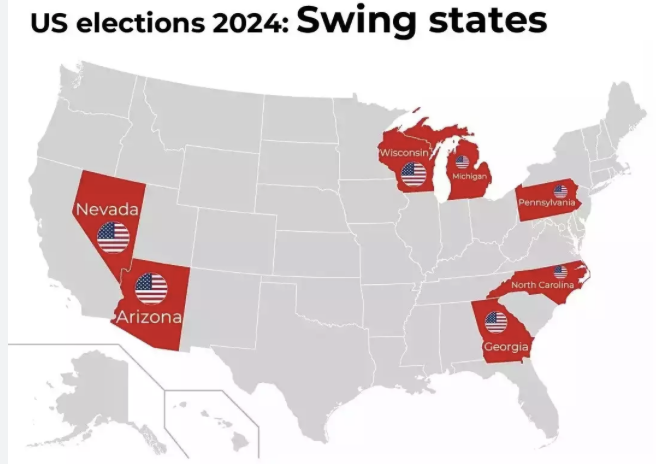 The new geography of ‘swing states,’ the focal points of the electoral map, were by 2024 mapped as the electoral gold that defined, or would defined, the currency of this Presidential election, as if these seven states alone had replaced the United States as the basis for deciding the election–a master myth of 2024 that, as it turned out, was hardly the case–but was of determining value.