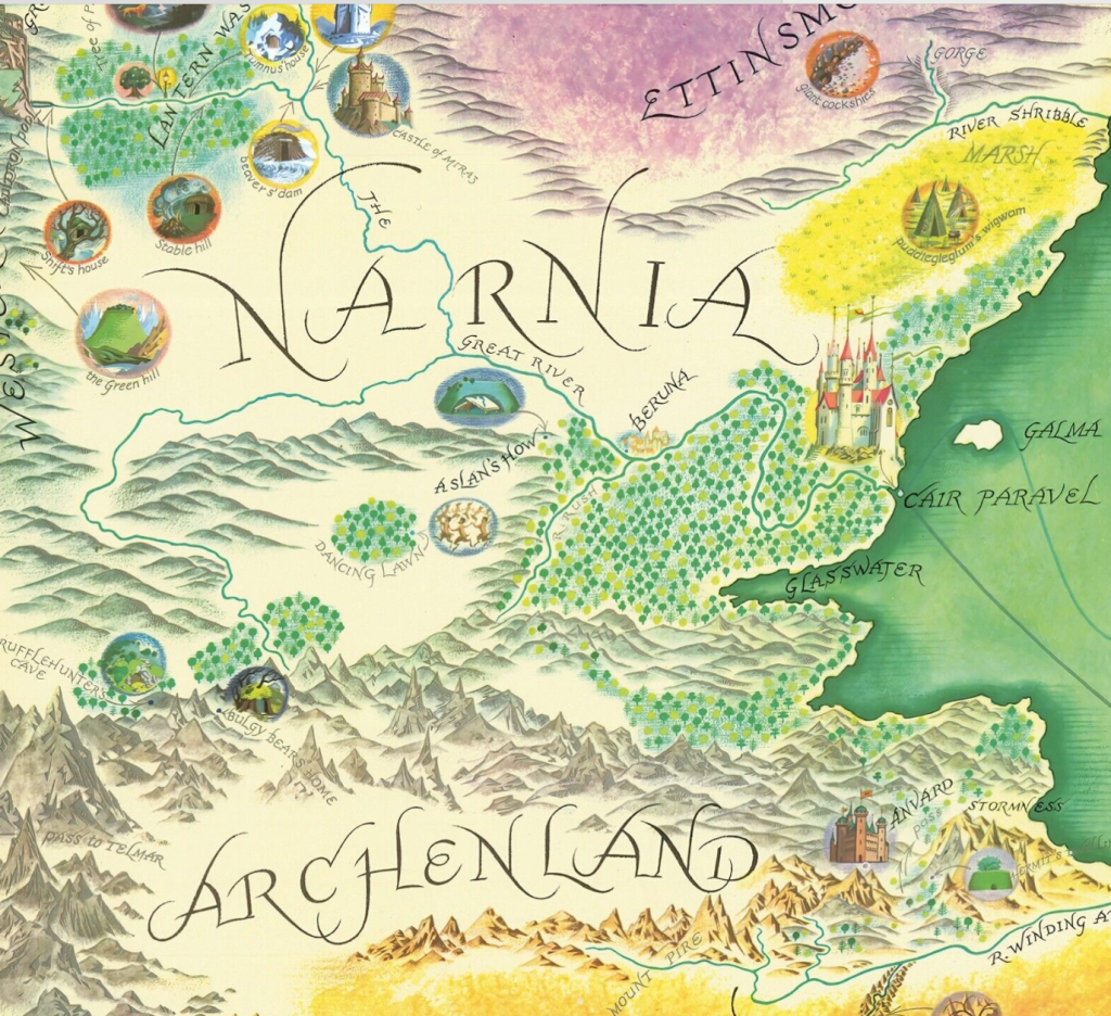 The map might one seen as ideal of an enchanted world, as well as an archetype for Tolkien’s and Lewis’ fictions, enchanting readers it invited to visit its forested landscapes as an ideal ‘outdoor’ space, a Paradise analogous to the realm of Narnia, ruled by its four Kings and Queens, the Pevensie children, whose rule inaugurated a Golden Age, offering evidence of an other-earthly paradise. In inviting the viewer to investigate a world that does not exist, the map invites them to investigate a fantasy landscape that it affirms as an actual landscape, using the map’s coded signs as a meta-poetic fiction, like The Earthly Paradise, leaving the industrialized landscape of England, or the new English countryside, to immerse oneself in a dream world, far from modern grime and noise, that he alone could lead us as to a new Jerusalem.