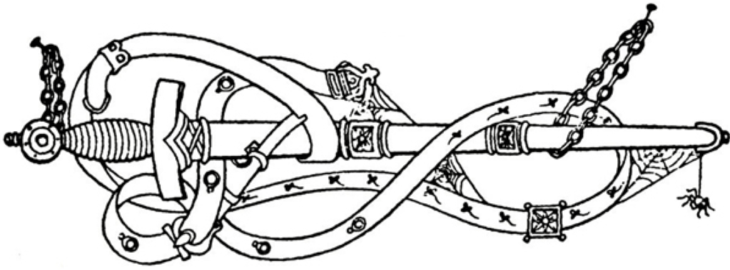 Were not the role of these swords and military arms of medieval times a search for more virtuous instruments of struggle, guided by faith, as much as Enlightened ends of government? Without reaching for any added metaphorical significance, either Freudian phallic symbol that was a symptom of repressed desire–if sometimes a sword was merely a sword, it was elevated to a symbol of “compromise formation” whose associations might well derive from the Nibelung Saga–or Blakean ecstatic inspiration (“Give me my sword of shining gold/give me my chariot of fire“) of renewing a sacred realm. For the sword Baynes illustrated as wrapped in neo-medieval girdle entered a land of magical enchantment, waiting to be taken up as a instrument of valiance from the chains on which it was suspended to liberate the Middle Kingdom. This is not the Wagnerian sword, for example, with which Sigurd sleeps so that he keep distance from Brunhilda, or a talismanic charm against temptation, that compensatorily stood in for a phallus, but for a lost world. Echoing the sword of the Christ Church War Memorial Garden, to those who died in the First World War, below a quotation from Bunyan’s Pilgrim’s Progress, the gilded sword of Farmer Giles recalled the virtues of the sword in an age of guns.