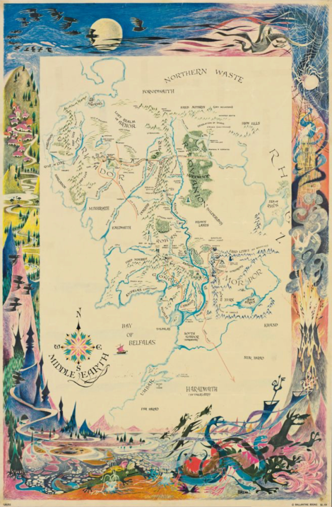 –that the topography was fixed in the. minds of fans, and in most posters of readers of Middle Earth. Middle Earth’s maps were not cited specifically as lying under copyright–the elegant interactive geospatial maps of Middle Earth are widely available from the LOTR project, keyed to Tolkien’s original plot, is an invitation to fan fiction–Baynes was the only artist Tolkien collaborated with on a map, enriching the toponymy and riverine course on the elegant map Baynes painted developed from 1969, which Tolkien praised as a “masterpiece.” One might, indeed, compare them to the maps drawn for the American Ballantine edition in 1969, otherwise popular to readers, of the American illustrator Barbara Remington, to Tolkien’s surprise, One might, indeed, compare them to the maps drawn for the American Ballantine edition in 1969, otherwise popular to readers, of the American illustrator Barbara Remington, if popular among his readers, and quite evocative of mood–and was the map by which I first navigated Middle Earth when I read the series.