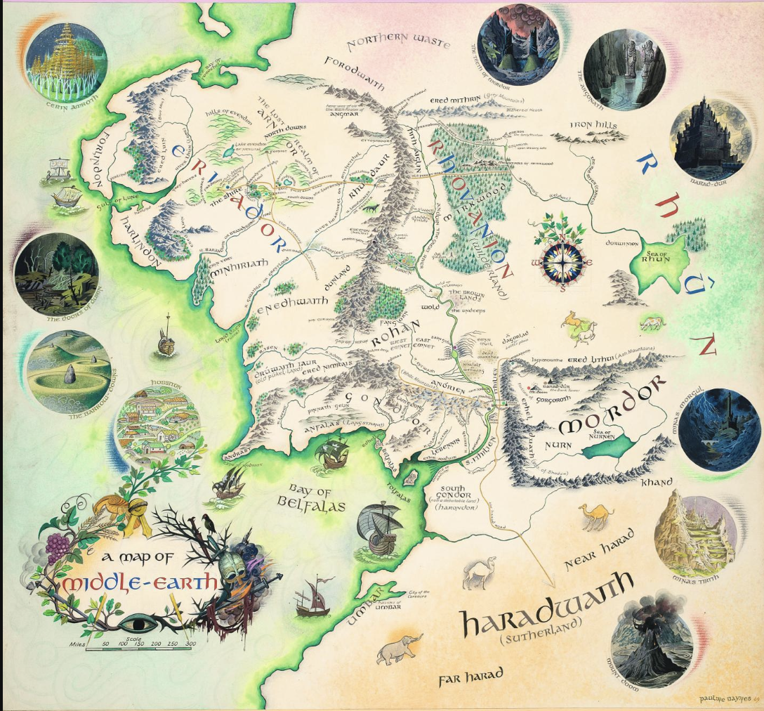 –that the topography was fixed in the. minds of fans, and in most posters of readers of Middle Earth. Middle Earth’s maps were not cited specifically as lying under copyright–the elegant interactive geospatial maps of Middle Earth are widely available from the LOTR project, keyed to Tolkien’s original plot, is an invitation to fan fiction–Baynes was the only artist Tolkien collaborated with on a map, enriching the toponymy and riverine course on the elegant map Baynes painted developed from 1969, which Tolkien praised as a “masterpiece.” One might, indeed, compare them to the maps drawn for the American Ballantine edition in 1969, otherwise popular to readers, of the American illustrator Barbara Remington, to Tolkien’s surprise, One might, indeed, compare them to the maps drawn for the American Ballantine edition in 1969, otherwise popular to readers, of the American illustrator Barbara Remington, if popular among his readers, and quite evocative of mood–and was the map by which I first navigated Middle Earth when I read the series.