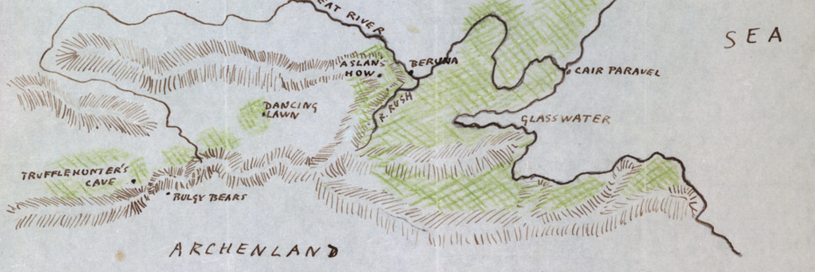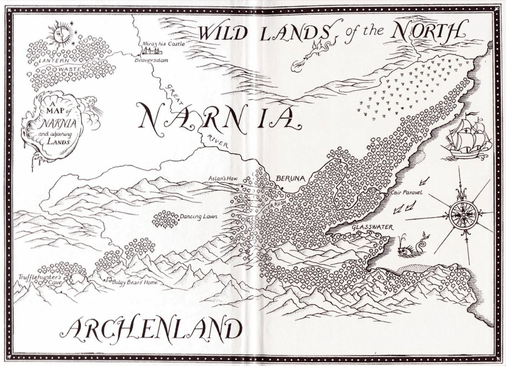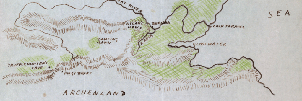–and a font that seemed to conjure the magic of the place. If the map was based on Lewis’ original, the cartographic insights she offers for a complex land. Did Lewis provide the map in draft from to Baynes, or did she sense that the map of ocean voyages effectively communicated a counterpart to the region whose font indicated its ideal nature to my eyes; Lewis, in contrast, focussed more on ensuring Narnia provided a truly green world for readers who, recently surrounded by the sounds of war, lived in regions where the bombing raids were still visible–as they still were in the London of the 1950s and 1960s, ensuring the survival among a generation of young readers of the so decidedly green lands surrounding the Lantern Waste, Miraz’ Castle, or the Irish-sounding castle Cair Paravel, across the daunting expanse of the Wild Lands of the North.