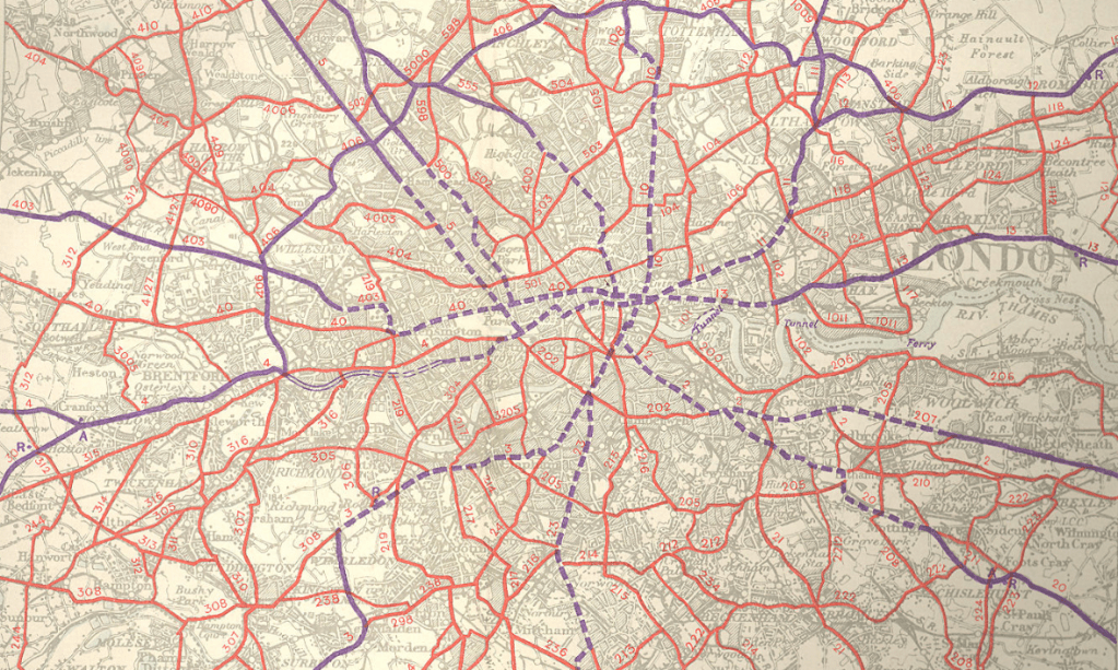 Road maps were increasingly produced for a market of motorists, foregrounding networks of paved roads, to be kept in “glove compartments,” privileging an anthropogenic space of built roadways. And already by 1927, the focus on roadways and the measurement of distance on roads as the A31 contrasted to the fields that surrounded Barmouth and Aberystwyth, as if the user was displacing one form of navigation of the countryside with another, more efficient, rooted in the shrinking of space that the maps actually performed in shrinking ten miles to an inch to but half an inch–evident in how London now stood, trunk roads in purple, by 1948, or after the professionalization of mapping systems on coordinates with a new level of abstraction far less demanding pictorial naturalization prominent in the early road maps of the Ministry of Transport, as they sought to acculturate audiences reading roadmaps to find the most suitable routes for automobile travel.