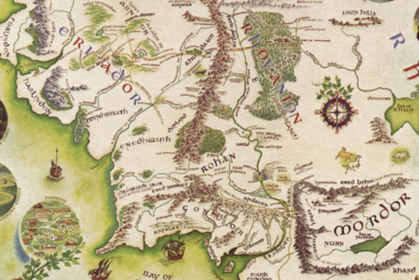 Baynes’ Narnian shores provided a crucial expansion of the series’ rich cartographic content. Ships may seem less prominent in Tolkien’s narrative, but the windrogse above Mordor reminds readers of the perilous if not fatalistic final overland voyage to rescue the Ring, and the provided a palpable canvas on which that voyage can occur, making the dangerousness of the voyage all there present, and perhaps the inviting calmness of the forests of Mirkwood, “the greatest forest of the Northern World” before it had been darkened by the evil forces of Sauron. The allegorical battle was mapped and remapped by Baynes during her long life, investing a cartographic claims of certitude in the maps that had begun from the large multi-sheet sketched maps Tolkien had made of Middle Earth during the World War of the 1940s, fixing it in our imaginations as a tangible surface in ways that suggest her deep dedication to the realization of the topography of the fantasy land’s public form.
