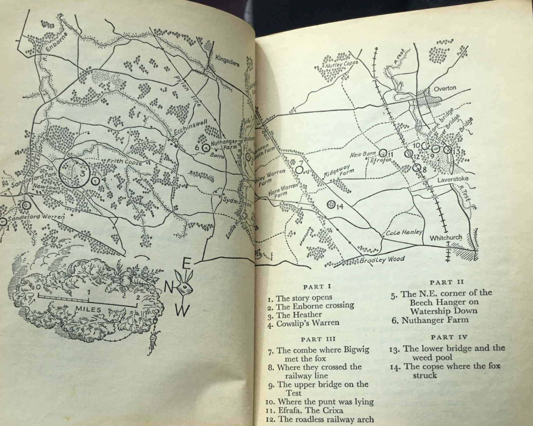 The new scale of the local she used for the rabbit warren in Watership Down (1972)–perhaps not as durable a fctansy world, and one of the more dated, that never achieved the mythic status to which the larger worlds of Lewis and Tolkien aspired in their self-conscious creation of modern myths of safe and dangerous spaces in the postwar years, have proved so durable for almost a century, through their transformation to film. But the rabbit warren in Watership Down, of a far more modest scale fitting many in the ecological turn of the cultivation of the local, underscored by the modest scale bar, if a rich hydrography, recalled the Ordnance Survey, it seems, that Lewis and Tolkien had sought to avoid. Indeed, if Watership Down was rather delightfully mapped at a reduced scale of rabbit warrens, between towns and rivers, the sense of a disappearing intersection of the animal and anthropogenic world is all to apparent in the several miles of rural countryside where rabbits dwell beside farms, in the Down beside the Heath that is rather idyllically preserved, but bound by the roadways that link Whitchurch, Overton and Kingsclere, cut up by ribbons of rail, highway that threaten to disturb the underground warren where the rabbits have long dwelled.