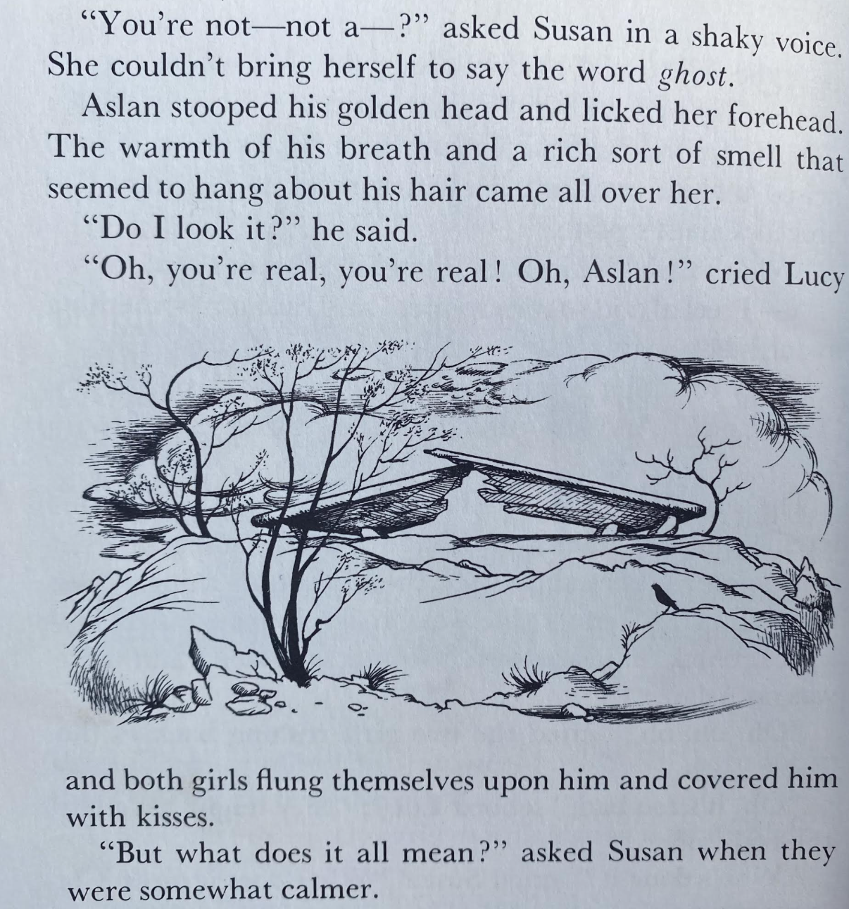 The culmination of the discovery of the Stone Table is also the site of remembering that this landscape is quite deeply real–not at all fantasy or illusion–as present to us as any, no matter what our instincts or rational tendencies might say. And the marker of the broken stone table, under the skies of Narnia, is likely to be lodged in our heads, no matter what it means to Lucy and Susan, as they are able to help restore Aslan to life, and allow this entire world to leave the Witch’s spell.