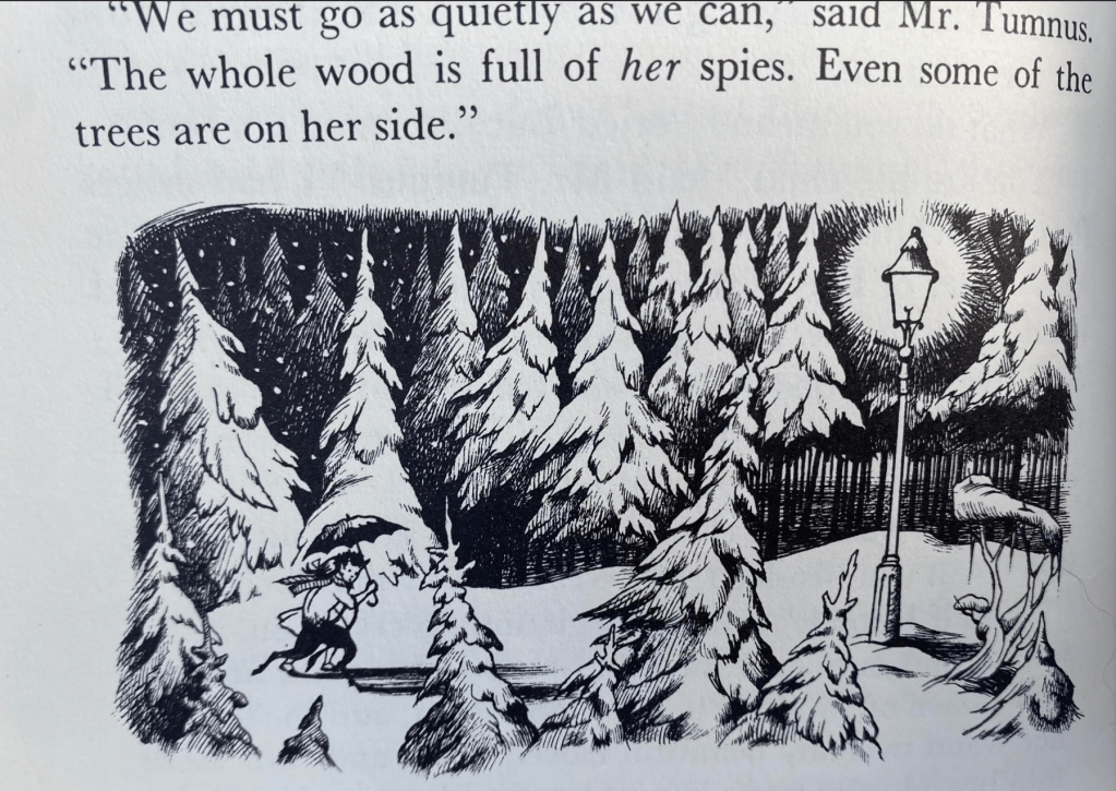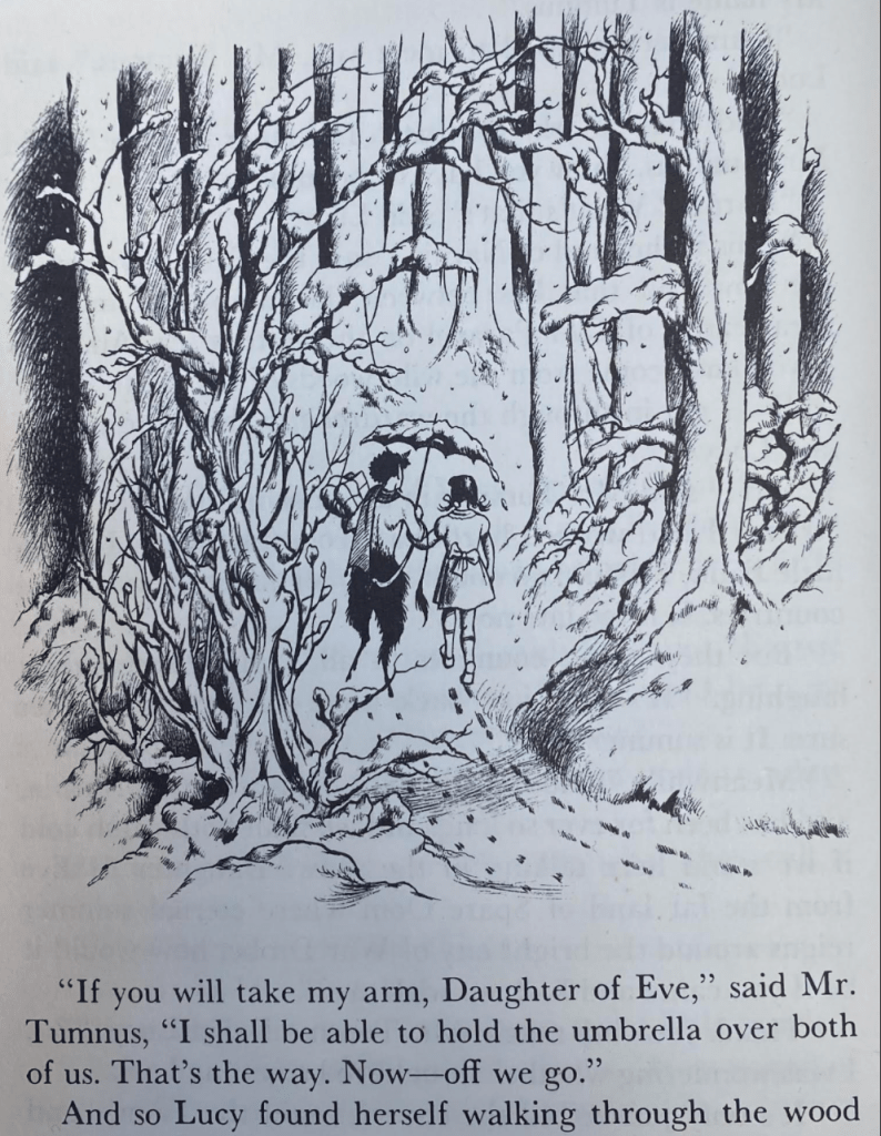 –as Mr. Tumnus guides her in the Narnian snow at an entrance point to another world she entered trough the portal of the eponymous wardrobe.