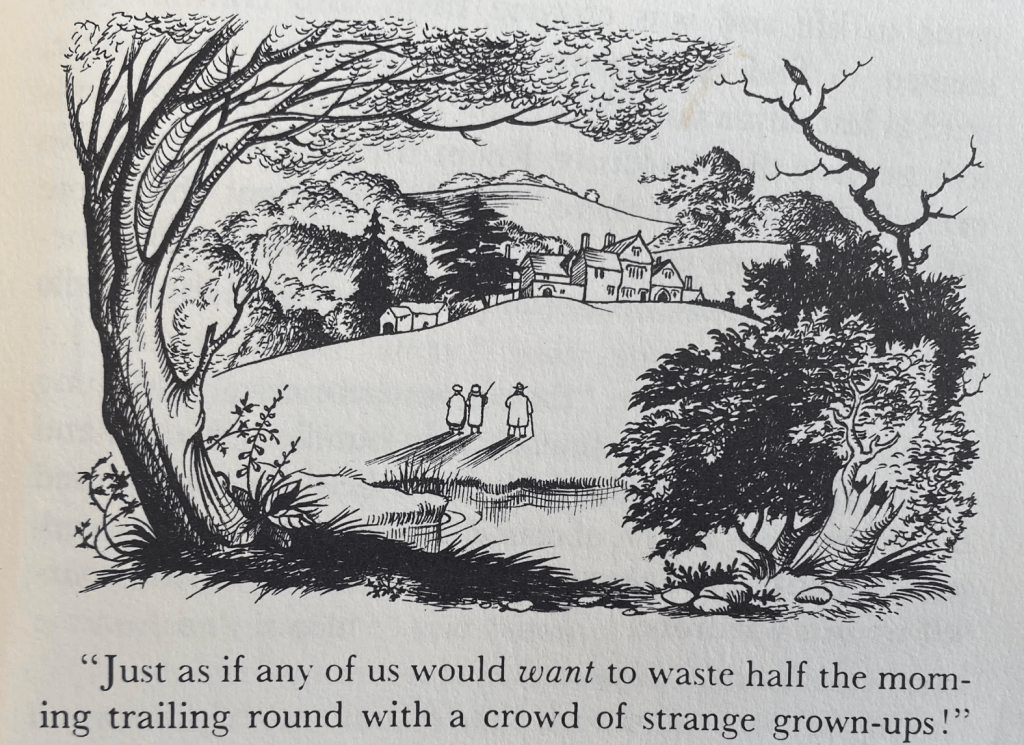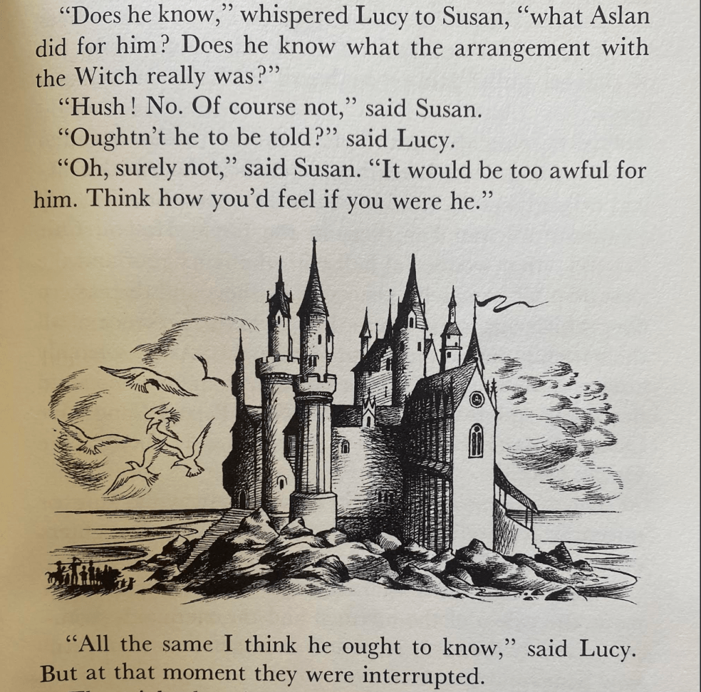 We gain. orientation only by illustrations as readers, one of a Manichaeans struggle of good and evil, that might mirror World War II or the hellish warfront of World War I Tolkien experienced at first hand, that broke with the “world of grown-ups.” Led by a growing cast of native informants to understand the stakes of their struggles, we gaini a clear sense of the scale of its landscape over time, and the hills and castles they must survey to learn the lay of its otherworldly green land. Baynes’ drawings assisted in the necessary task of navigation–and not only the deep shadows cast by its evil Witch–in the sense of an unknown world which it is time for us to navigate and learn to inhabit as we read Lewis’ prose, rather than “waste” time “with a crowd of strange grown-ups!”